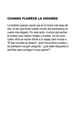 CUANDO FLORECE LA HIGUERALa tradici%u00f3n popular cuenta que en la noche m%u00e1s larga del a%u00f1o, el velo que divide nuestro mundo del sobrenatural se vuelve m%u00e1s delgado. Por esta raz%u00f3n, muchos aprovechan la ocasi%u00f3n para realizar rituales y pruebas. As%u00ed es como cuatro ni%u00f1os se re%u00fanen frente a un espejo para invocar a %u201c%u00c9l que concede los deseos%u201d, quien los pondr%u00e1 a prueba y les plantear%u00e1 una gran pregunta: %u201c%u00bfqu%u00e9 est%u00e1n dispuestos a sacrificar para conseguir lo que quieren?%u201d