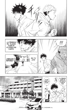 chan ¡la presencia !!! del talismán acaba de volverse más fuerte! fiuun ¡¡menuda ¡eh, tú! rapidez!! ¡oye! ¡ j al parecer ni que o corre 50 d e fuera un r ! metros en coche... 3 segun- dos. daisan JUJUTSU KAISEN © 2018 by Gege Akutami / SHUEISHA Inc.