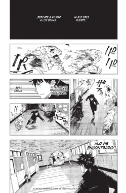 ...dedícate a ayudar ya que eres a los demás. fuerte... plomf plomf chas está el número de cerca. maldiciones va en aumento. zas !! fiun ¡¡lo he encontrado!! JUJUTSU KAISEN © 2018 by Gege Akutami / SHUEISHA Inc.
