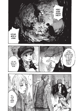 Pero ¿qué dices, Theo? Volva- mos a casa. Puede que sean compatriotas, pero, en cuan- to les den la orden, matarán a No hay modo de todo el pueblo. salvar a nadie. Y... po... ¿por qué harían eso? © Tsutomu Takahashi / KODANSHA Ltd.