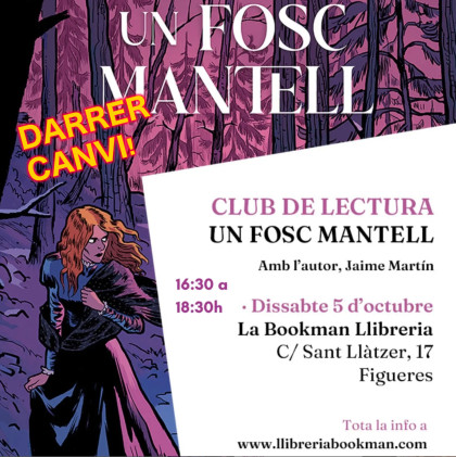 El sábado 5 de octubre de 16:30 a 18:30 en la librería La Bookman de Figueres, Jaime Martín participará en un club de lectura dedicado a su última obra Un oscuro manto (Un fosc mantell). Tenéis toda la información en https://www.llibreriabookman.com/