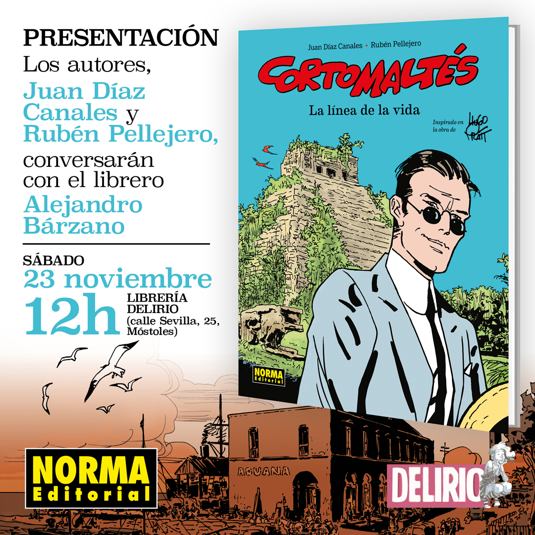 El sábado 23 de noviembre a las 12:00 los autor de Corto Maltés. La línea de la vida, el guionista Juan Díaz Canales y el dibujante Rubén Pellejero, conversarán con el librero Alejandro Bárzano en la librería Delirio de Móstoles.