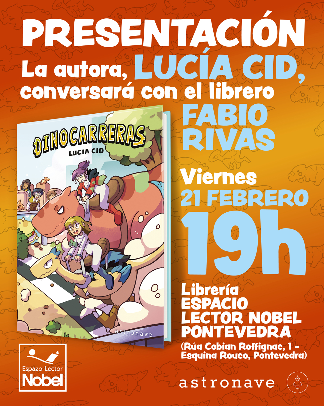 El viernes 21 de febrero a las 19:00 la autora de Dinocarreras, Lucía Cid, presentará y firmará su obra en la librería Espacio Lector Nobel de Pontevedra. El acto estará moderado por el librero Fabio Rivas.