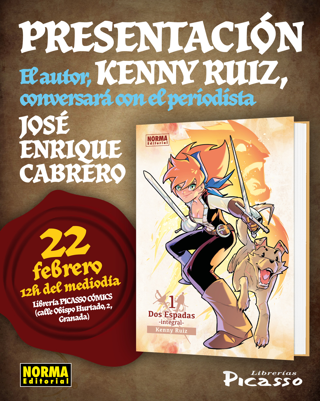 El sábado 22 de febrero a las 12:00 tendremos la presentación y sesión de firmas del manga Dos Espadas con su autor Kenny Ruiz. El acto se llevará a cabo en la librería Picasso Cómics y estará moderado por el periodista José Enrique Cabrero.
