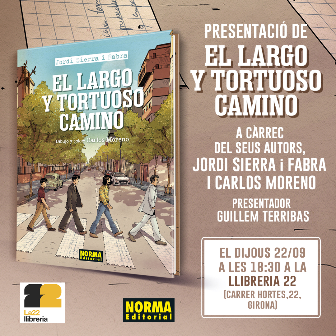Los autores de El largo y tortuoso camino, Jordi Sierra i Fabra y Carlos Moreno, presentarán y firmarán su obra en la Llibreria 22 de Girona el jueves 22 de septiembre a las 18:30.