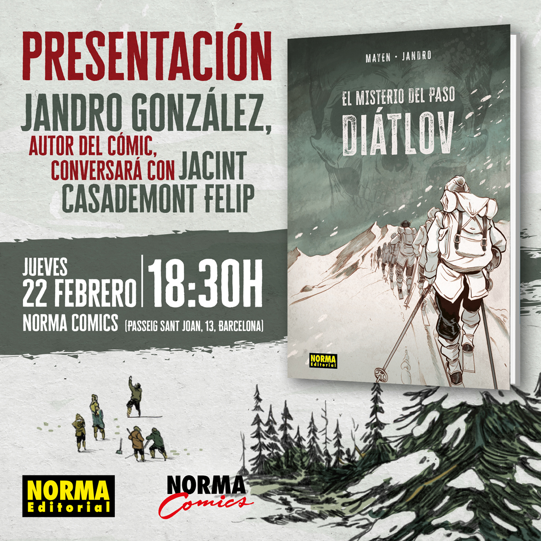 El dibujante del cómic El misterio del paso Diátlov, Jandro González, conversará con Jacint Casademont el jueves 22 de febrero a las 18:30 en la librería Norma Comics de Barcelona.
