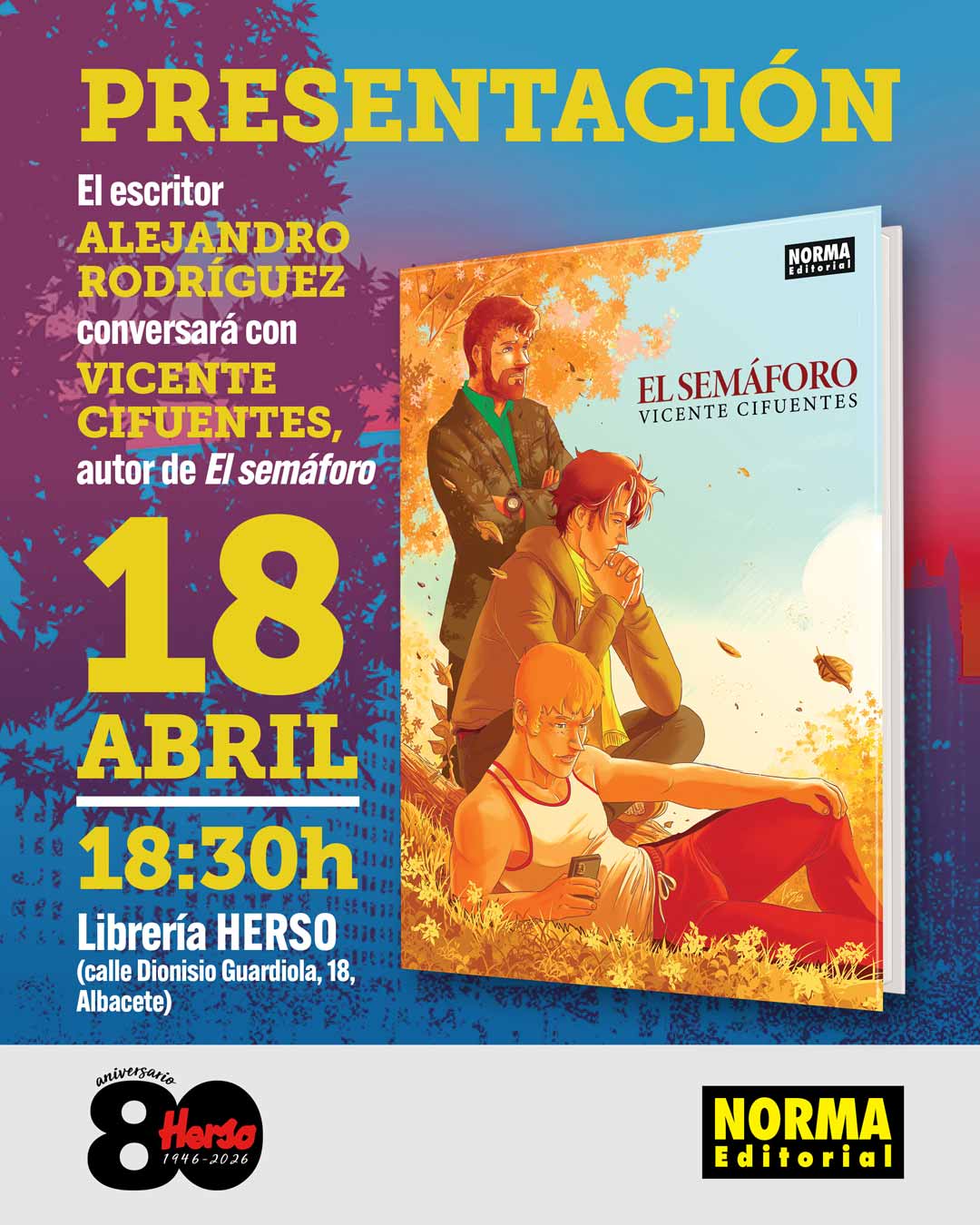 El escritor Alejandro Rodríguez conversará con el Vicente Cifuentes, autor de Elsemáforo, el sábado 18 de abril a las 18:30h en Librería Herso (calle Dionisio Guardiola, 18, Albacete).