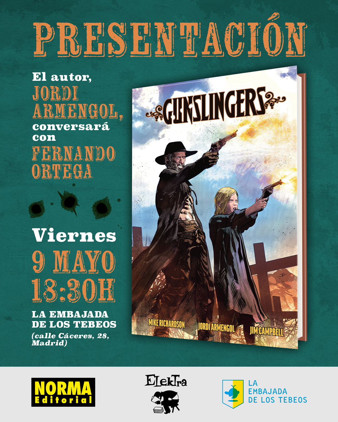 El viernes 9 de mayo a las 18:30 el dibujante Jordi Armengol presentará y firmará su último trabajo, Gunslingers, en la librería La Embajada de los Tebeos de Madrid. El acto estará moderado por Fernando Ortega.