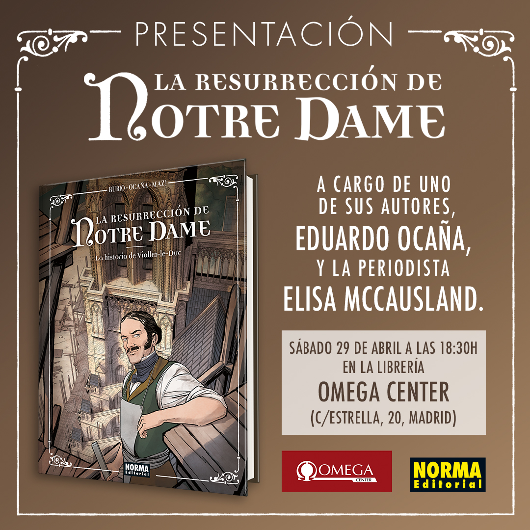 El sábado 29 de abril a las 18:30 habrá la presentación de La resurrección de Notre Dame con su dibujante, Eduardo Ocaña, y la periodista Elisa McCausland en la librería Omega Center de Madrid.