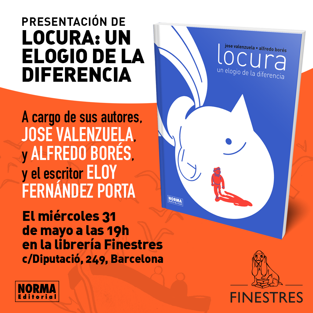 El miércoles 31 de mayo a las 19:00 habrá una presentación del cómic Locura: un elogio de la diferencia a cargo de sus autores, Jose Valenzuela y Alfredo Borés, junto al escritor Eloy Fernández Porta. Os esperamos en la librería Finestres de Barcelona.