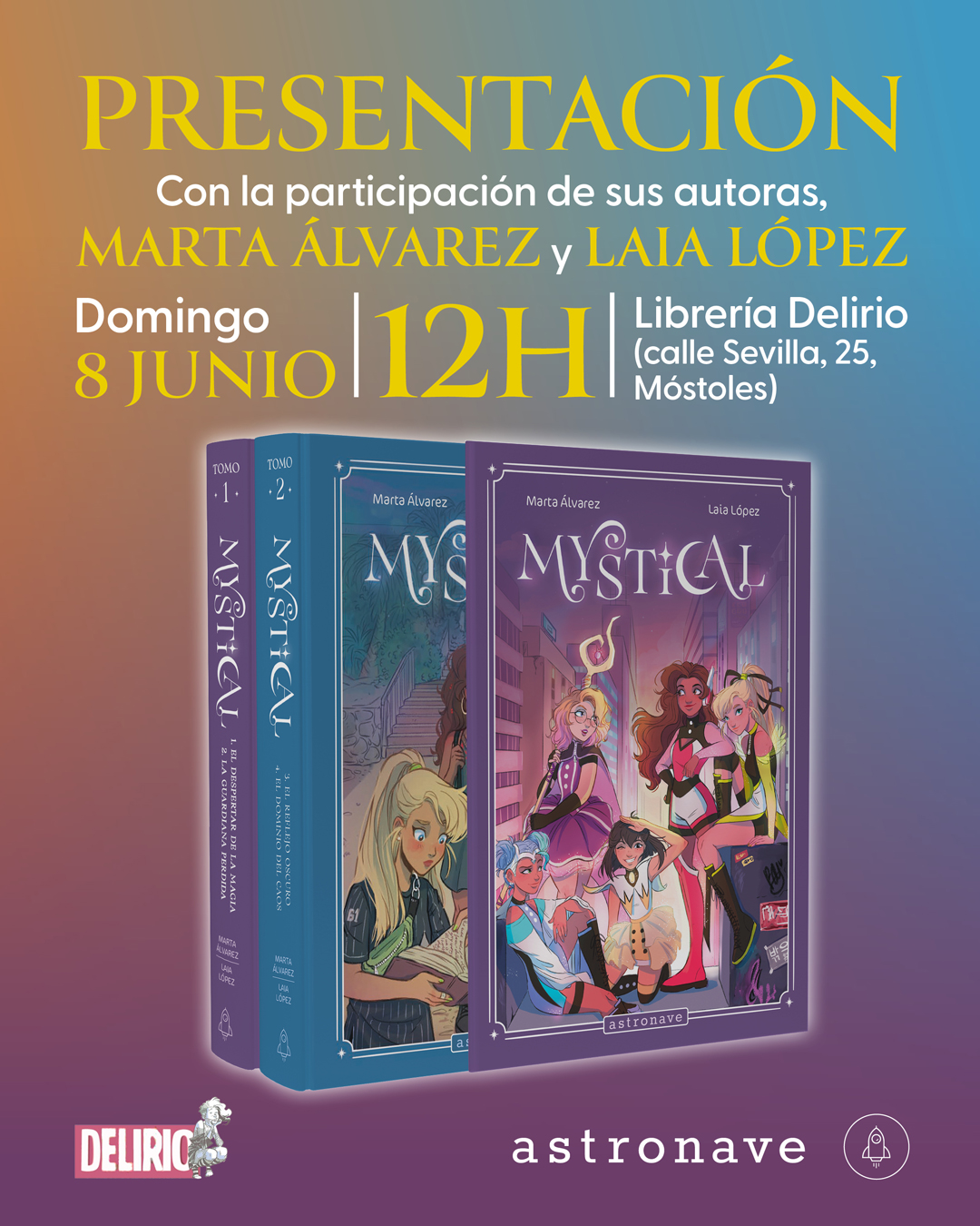 El domingo 8 de junio a las 12:00 las autoras de Mystical, Marta Álvarez y Laia López, presentarán su obra en la librería Delirio de Móstoles.