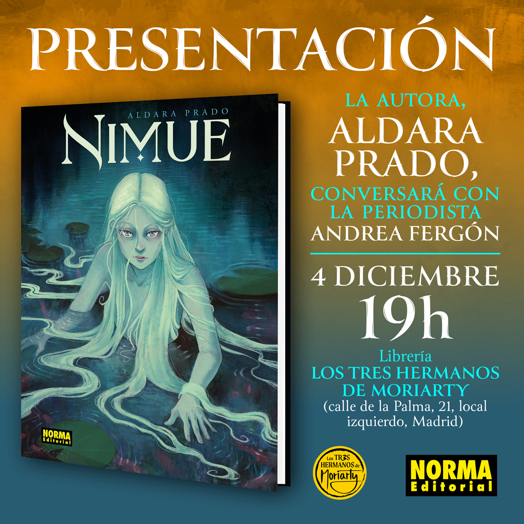 El miercolés 4 de diciembre a las 19:00 la autora de Nimue, Aldara Prado, presentará y firmará ejemplares de su obra en librería Los Tres Hermanos de Moriarty de Madrid. El acto estará moderado por la periodista Andrea Fergón.