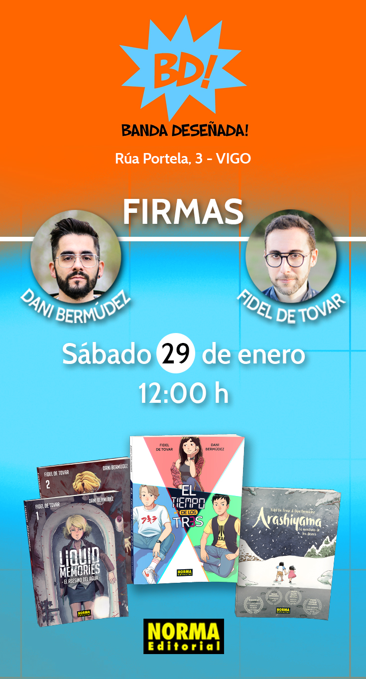 Los autores de El tiempo de los tres, Fidel de Tovar y Dani Bermúdez, harán ruta de firmas por Galicia. Los autores visitarán la librería Banda Deseñada! en Vigo el sábado 29 de enero a las 12:00.