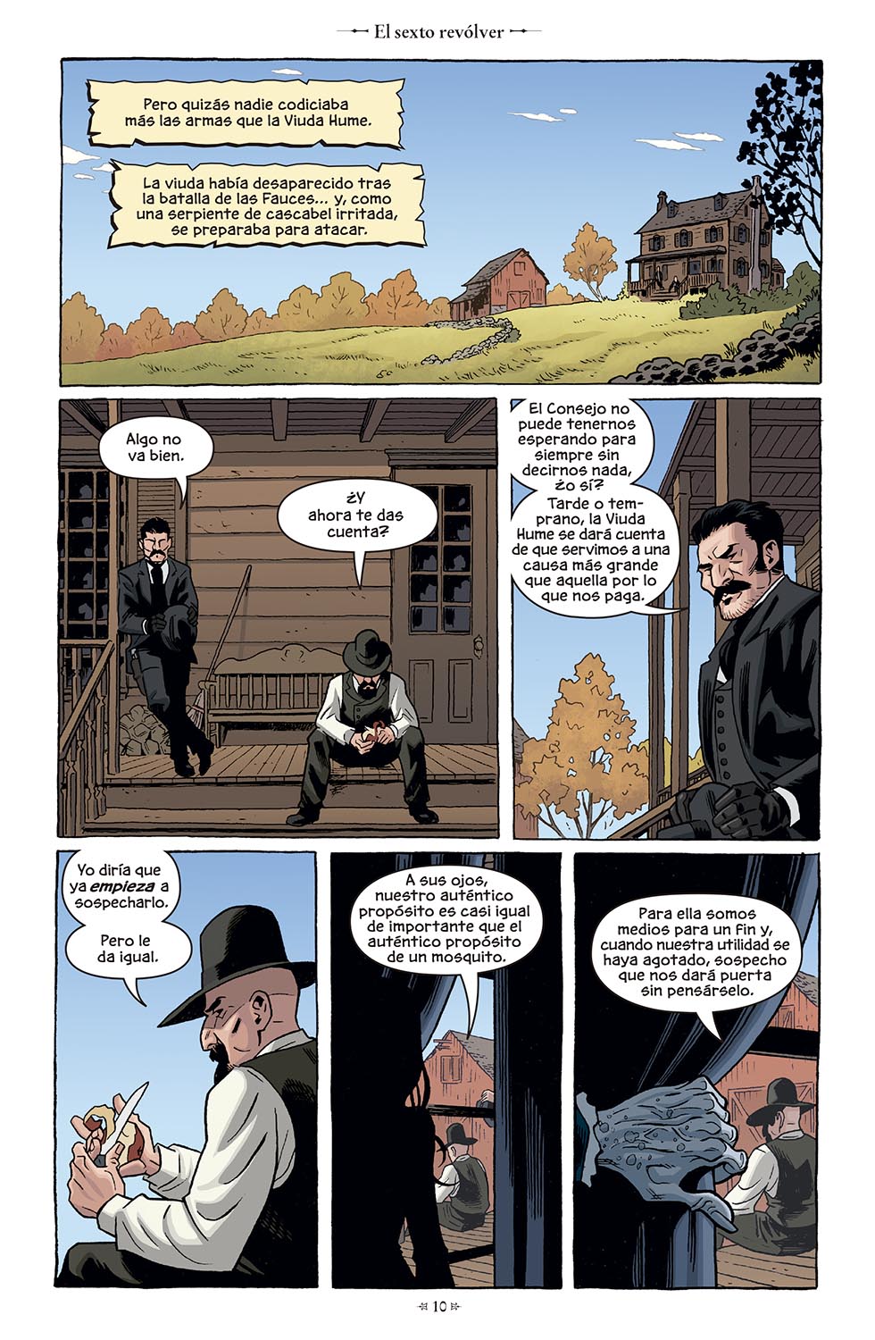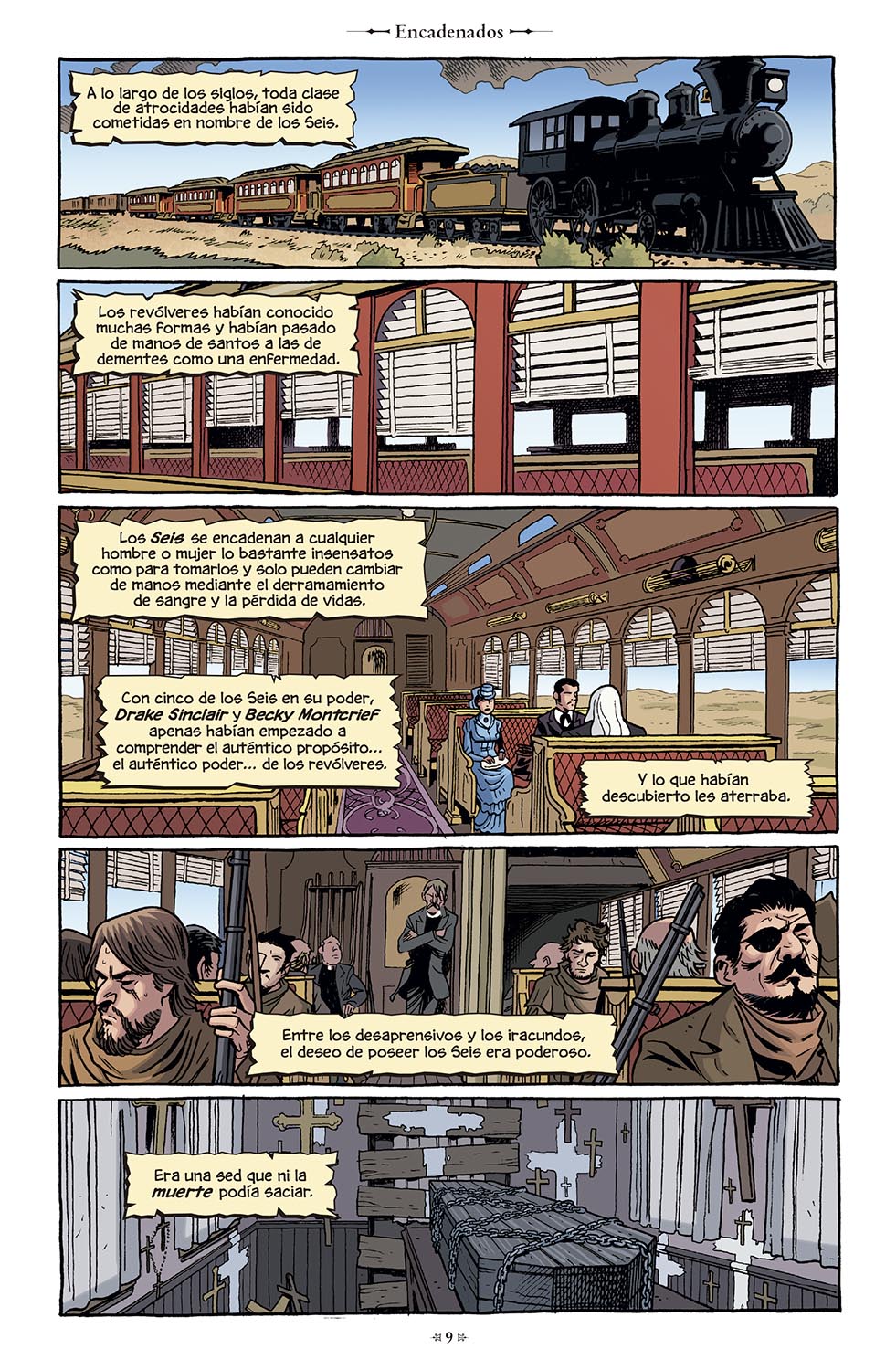 Acompañados de una misteriosa orden de monjes, Becky y Drake viajan en secreto a bordo de un tren con la intención de enterrar el cuerpo del General Hume en suelo sagrado. Pero tras sufrir un terrorífico asalto al tren, Drake desaparece sin dejar rastro. Sola, Becky irá en busca de Drake en un viaje que la llevará de una fortaleza en las montañas a un pueblo decadente y un emplazamiento subterráneo. Cullen Bunn y Brian Hurtt, ahora también acompañados de Tyler Crook, continúan a todo galope con su western fantástico para contarnos el destino de Becky, Drake y el Sexto revólver.
