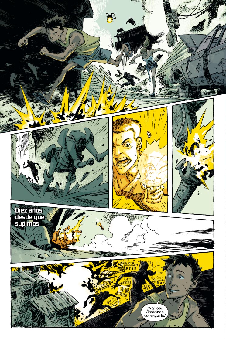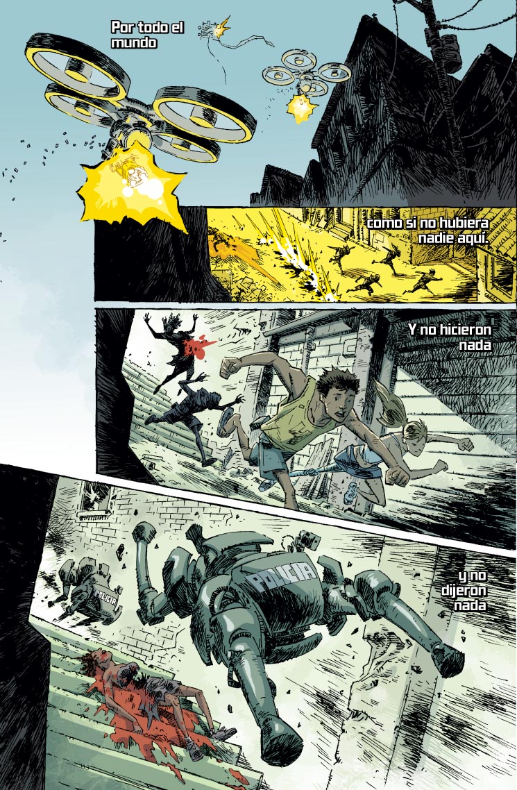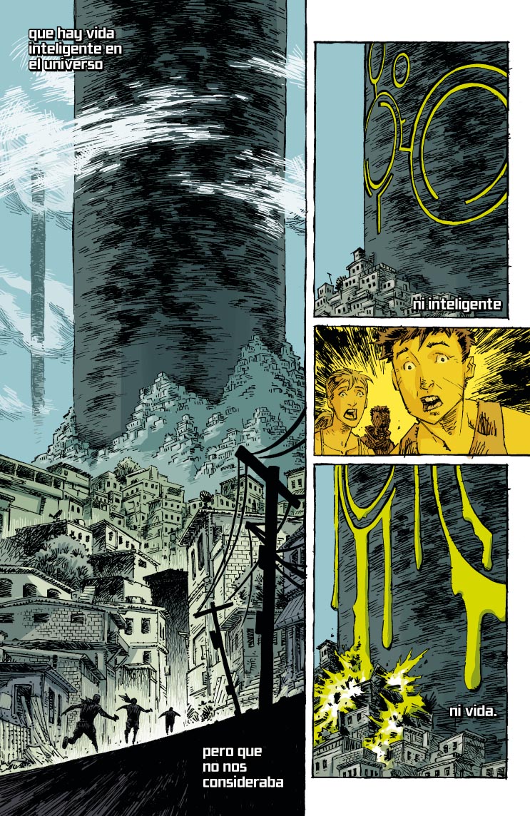 Erguidos sobre la superficie de la tierra como árboles. Ejerciendo una presión silenciosa en el mundo, como si nadie viviera aquí. Hace diez años que descubrimos que hay otra forma de vida inteligente en el universo, pero que no nos considera a nosotros ni inteligentes, ni vivos. Trees (Árboles) es la nueva obra de ciencia ficción de Warren Ellis (Transmetropolitan, Inyección) y Jason Howard (El asombroso hombre-lobo). Una mirada a un futuro cercano en el que la vida prosigue a la sombra de los Árboles: en China, un joven artista llega a una “zona cultural especial” bajo un Árbol; en Italia, una mujer cuya única protección es una banda fascista, conoce a un hombre que le enseñará nuevas habilidades letales; y en Svalbard, un grupo de científicos descubrirá que los Árboles no están tan dormidos como aparentan.