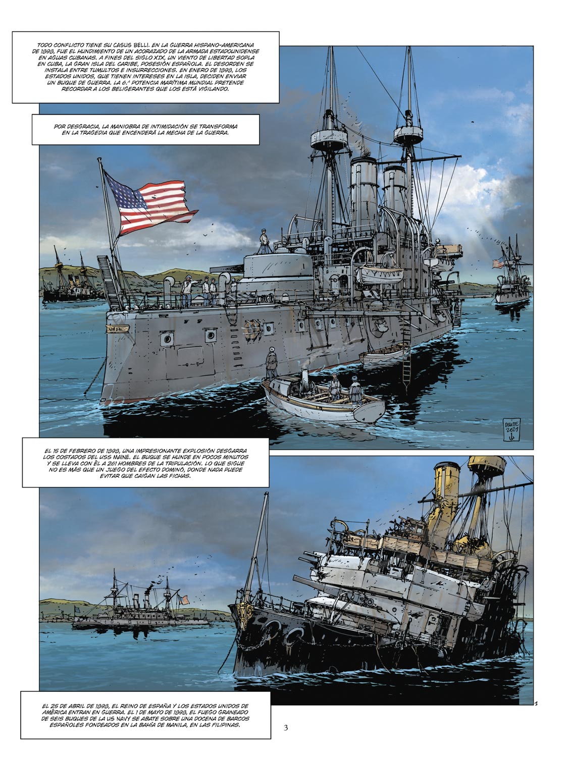 La mayor batalla naval de la guerra hispano-americana. En enero de 1898, siendo testigos de los disturbios civiles que sacuden desde hace varios años la gran isla de Cuba, todavía territorio español, los Estados Unidos deciden enviar allí uno de sus buques de guerra. Con esta maniobra, la sexta potencia marítima mundial quiere recordar a los beligerantes que sigue con atención los acontecimientos. Por desgracia, lo que solo debía ser una maniobra de intimidación se convierte en una tragedia. Mientras cae la noche sobre las tranquilas aguas del puerto de La Habana, el 15 de febrero de 1898, una impresionante explosión desgarra los costados del USS Maine…