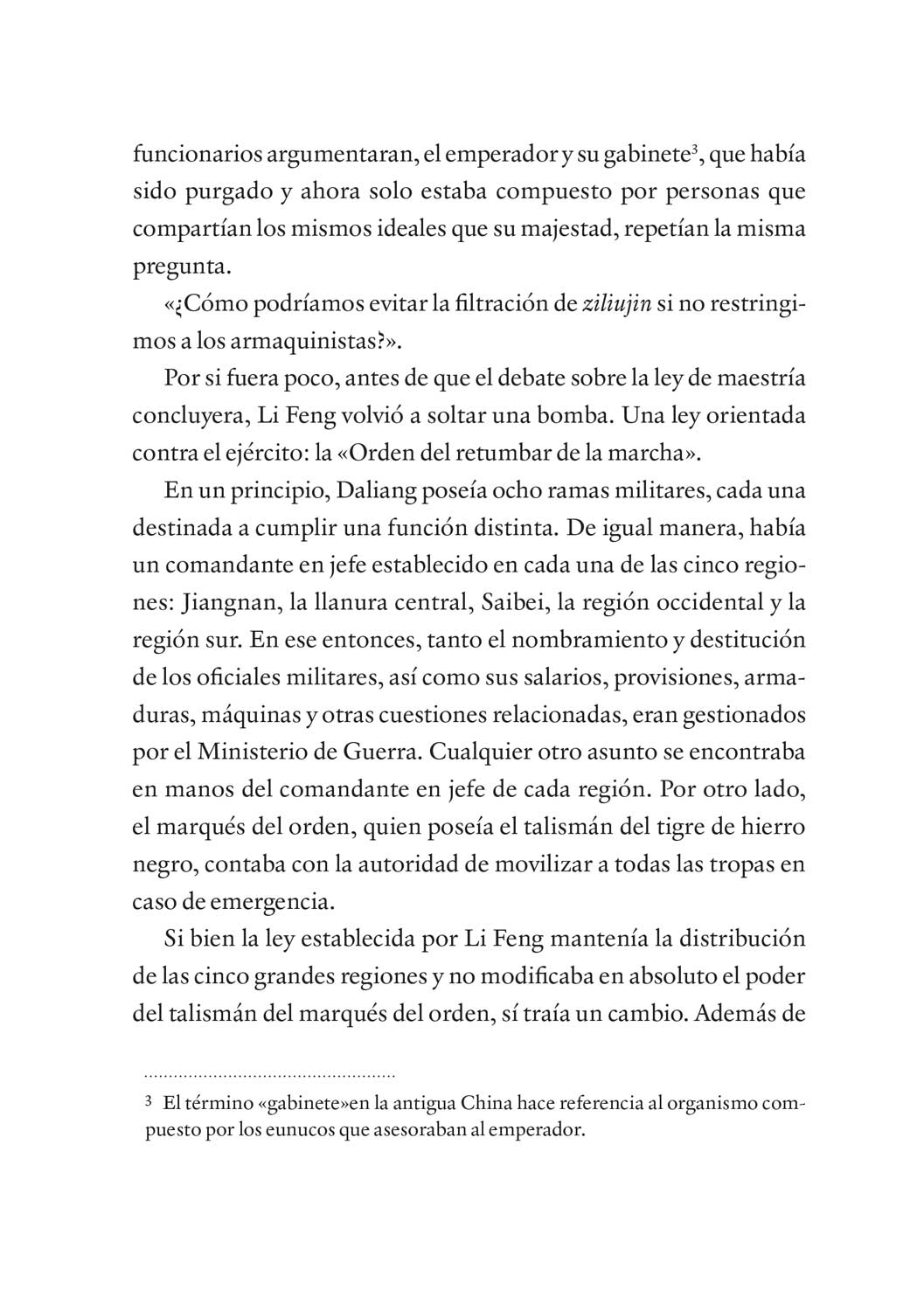 Bajo el reinado del emperador Long’an, Daliang se tambalea. A los problemas económicos se suman la rebelión del príncipe Wei y la temida «ley de maestría», que restringe el poder de los armaquinistas independientes. La «orden del retumbar de la marcha» busca someter a la milicia, pero solo logra avivar el resentimiento de los ejércitos. En medio del caos, un nuevo conflicto estalla entre los soldados del sur, los bandidos de las montañas y las tropas de Gu Yun, revelando un peligro aún mayor: el contrabando de ziliujin, la sustancia que sostiene el poder del imperio.