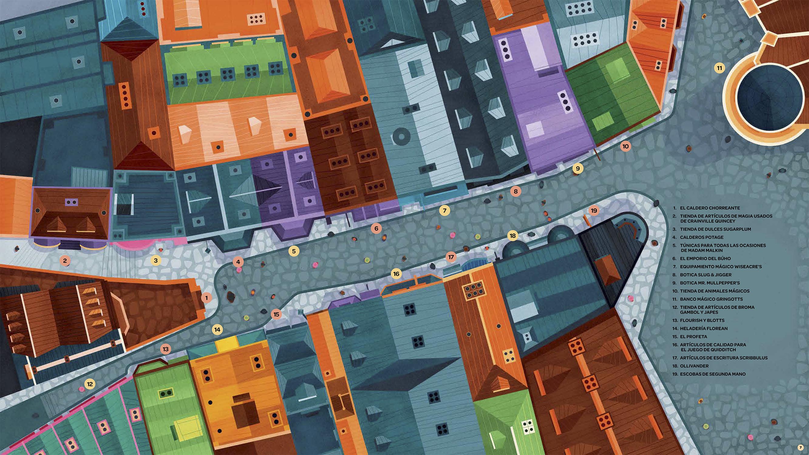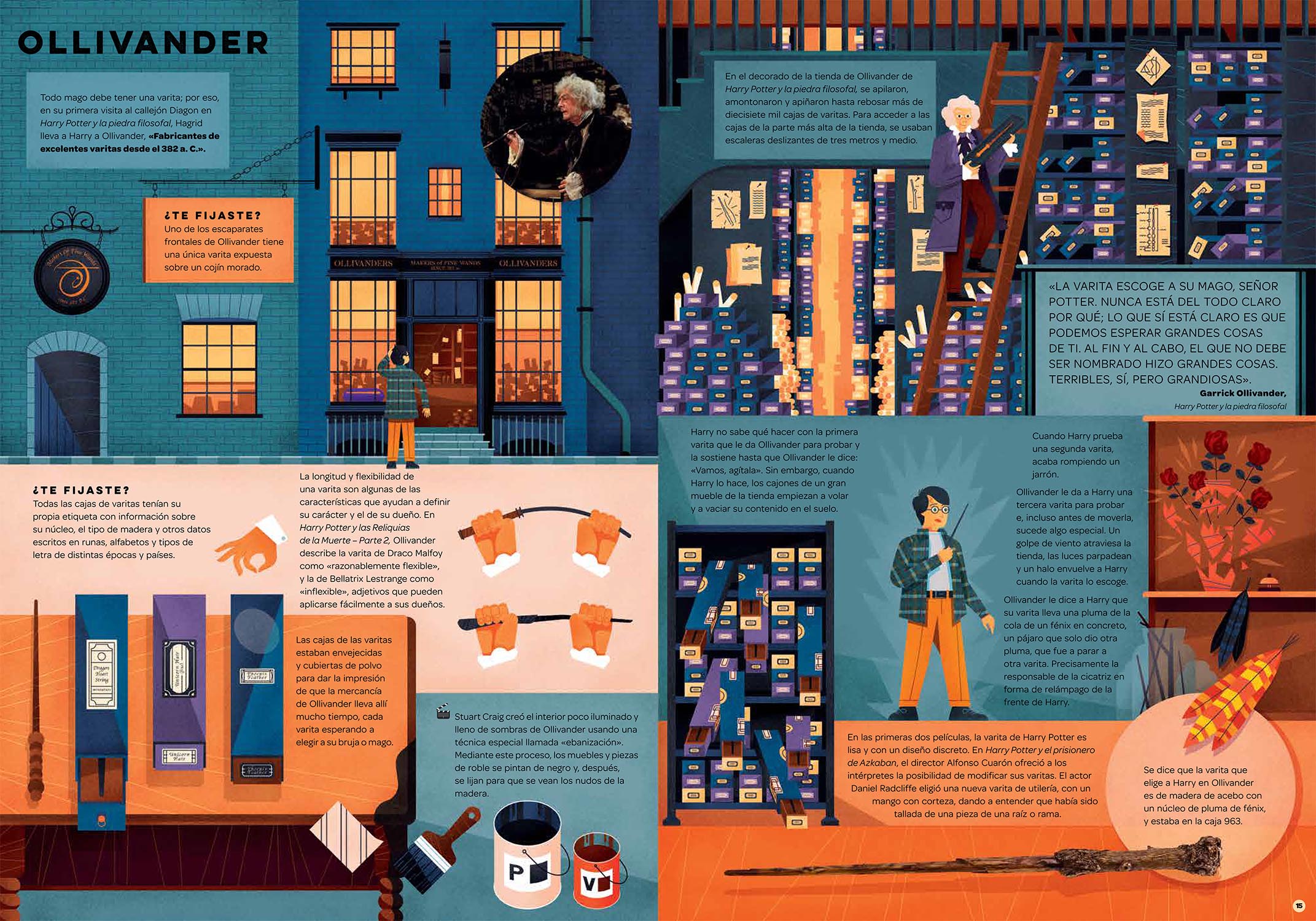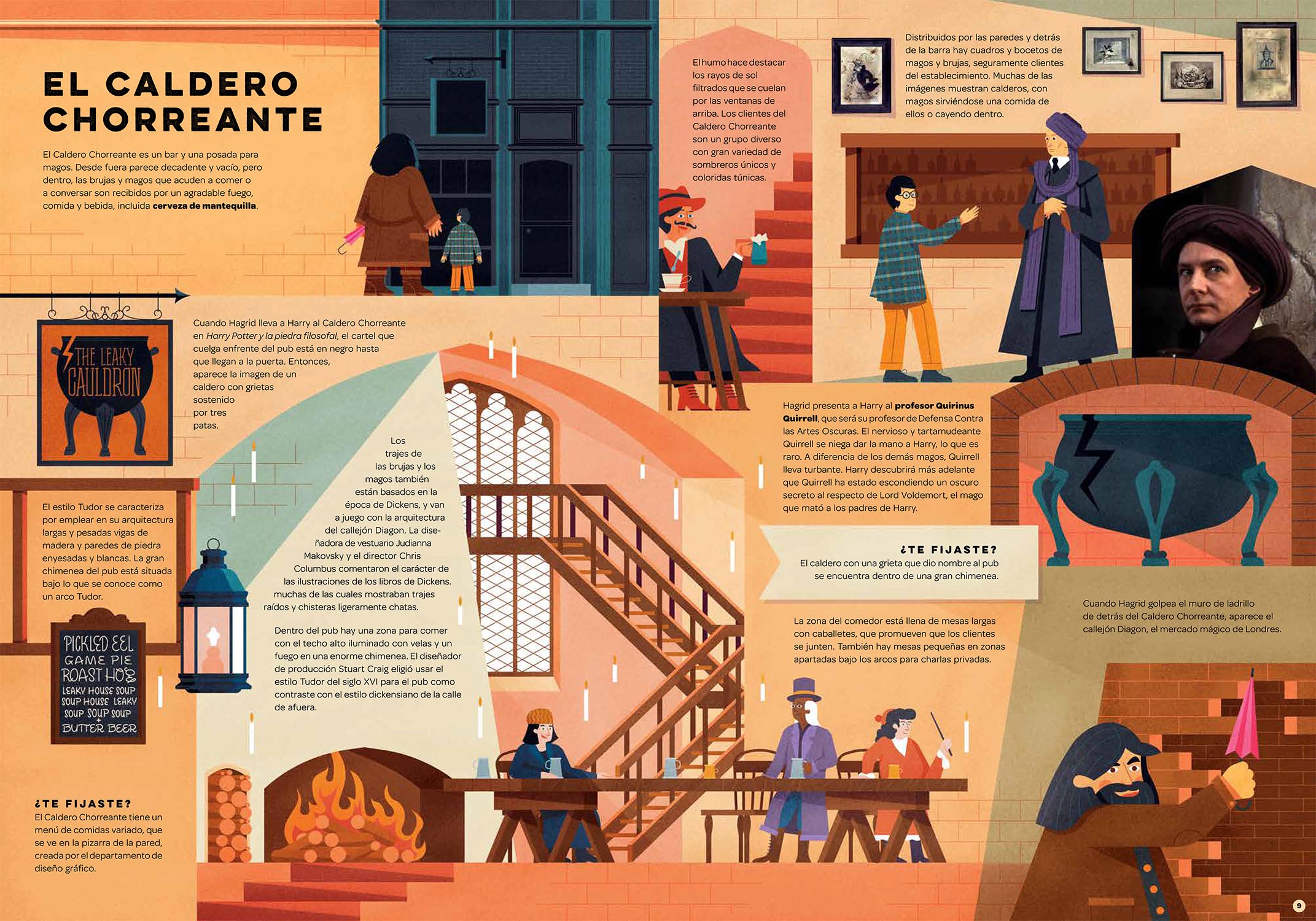 Explora el callejón Diagon con preciosas ilustraciones llenas de detalles y color. Desde las cargadas estanterías de Ollivander y Sortilegios Weasley a las cámaras de Gringotts y mucho más, este es un viaje a las localizaciones favoritas de los fans de las películas de Harry Potter. Gracias a los dibujos inmersivos del callejón mágico asistirás a escenas icónicas, verás a tus magos y brujas más queridos, artefactos encantados y mucho más. Y, por el camino, te explicaremos fascinantes anécdotas y datos sobre la magia cinematográfica que dio vida a Harry Potter en la gran pantalla.