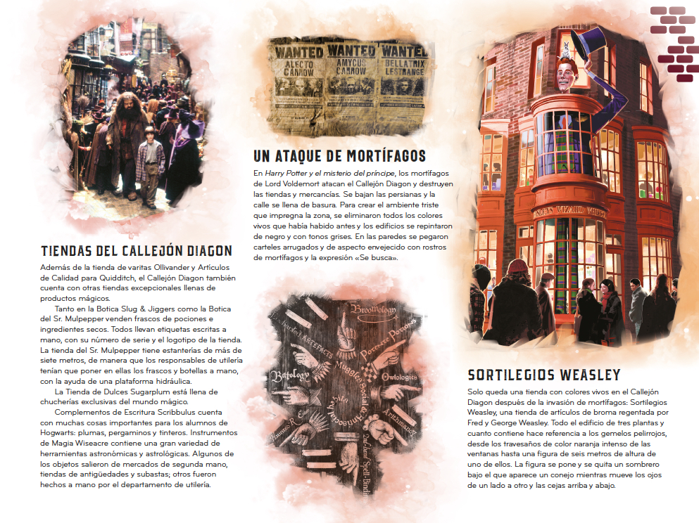 Revisita el mundo mágico de Harry Potter mediante cuatro in- trincados dioramas con múltiples capas que capturan localizacio- nes inolvidables de las películas. Desde Hogwarts y Hogsmeade hasta el Callejón Diagon y el Ministerio de Magia, todas las esce- nas están recortadas con láser para obtener la mayor precisión y un magnífico nivel de detalle. Cada una de ellas va acompañada de información esencial sobre los lugares mágicos, además de divertidos datos sobre la creación de las películas. Diseñado para fascinar tanto a los fans veteranos de Harry Potter como a los ni- ños, este libro es un tesoro para toda la familia.