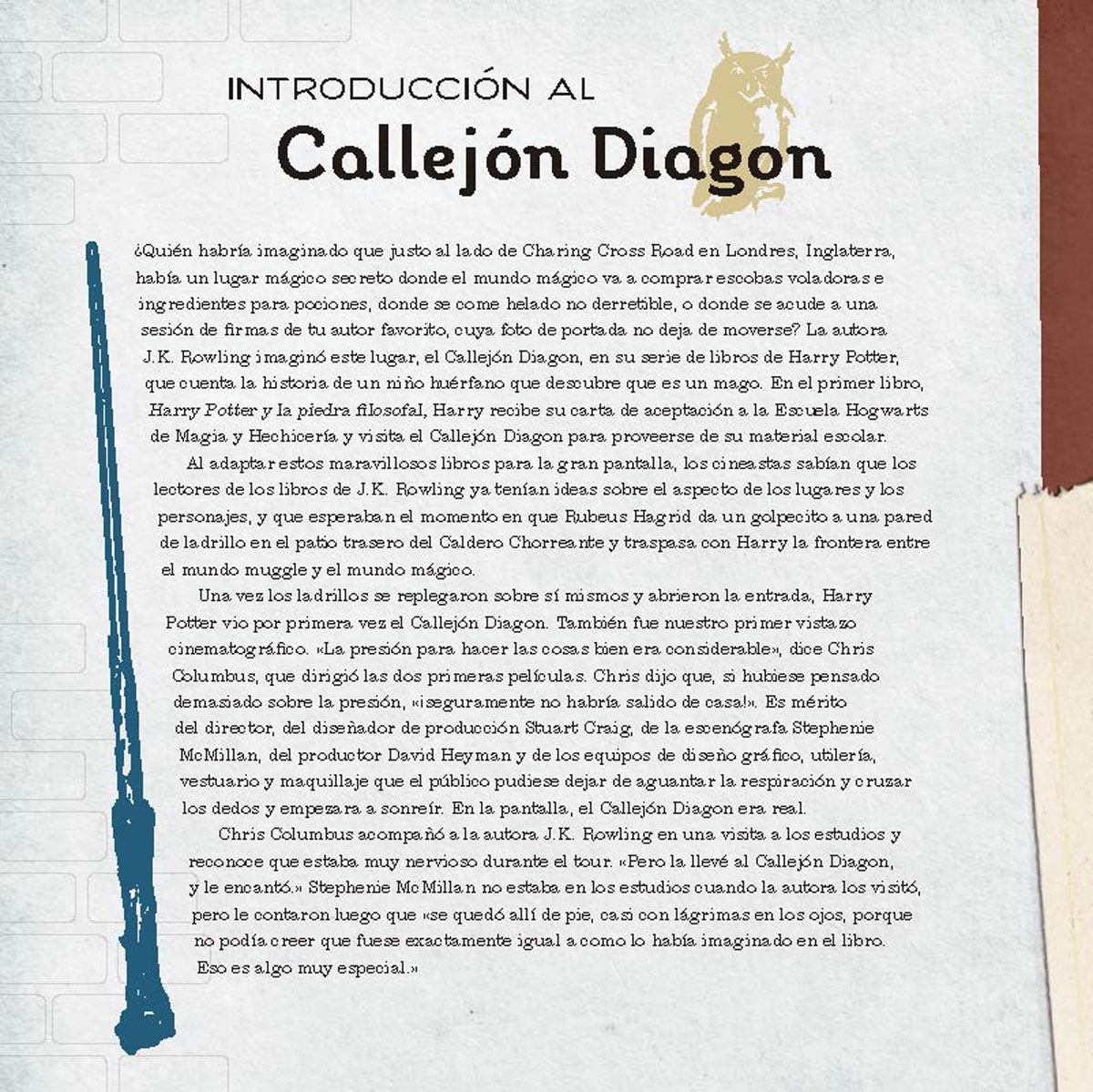 En este álbum mágico los lectores disfrutarán de un viaje interactivo por el Callejón Diagon de las películas de Harry Potter, pasando por el Banco Mágico de Gringotts y la tienda de varitas Ollivanders, Sortilegios Weasley y muchos lugares más. Los perfiles de cada tienda incluyen arte conceptual, fotografías e interesantes comentarios de los actores y el equipo de rodaje, ofreciendo a los lectores una mirada única a esta localización recordada con tanto cariño. Este volumen imprescindible también incluye elementos interactivos, un mapa del Callejón Diagon, la lista de material escolar de Harry Potter, pegatinas, y otros objetos extraordinarios.