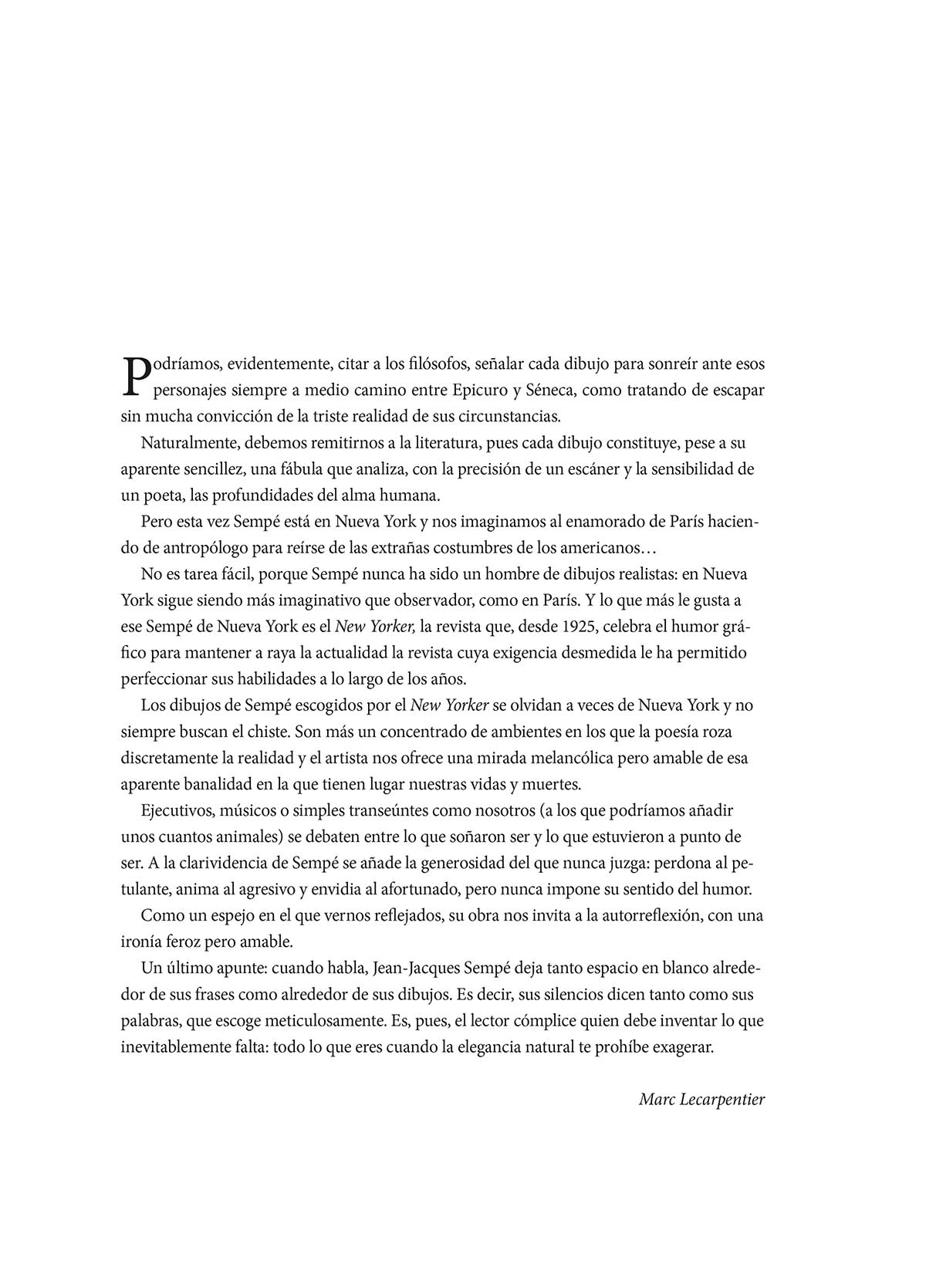 Estos dibujos neoyorquinos, de los cuales muchos permanecían inéditos, se presentan recopilados por primera vez en el presente volumen, acompañados por una entrevista con Marc Lecarpentier, antiguo director de redacción y presidente de Télérama. En ellos se