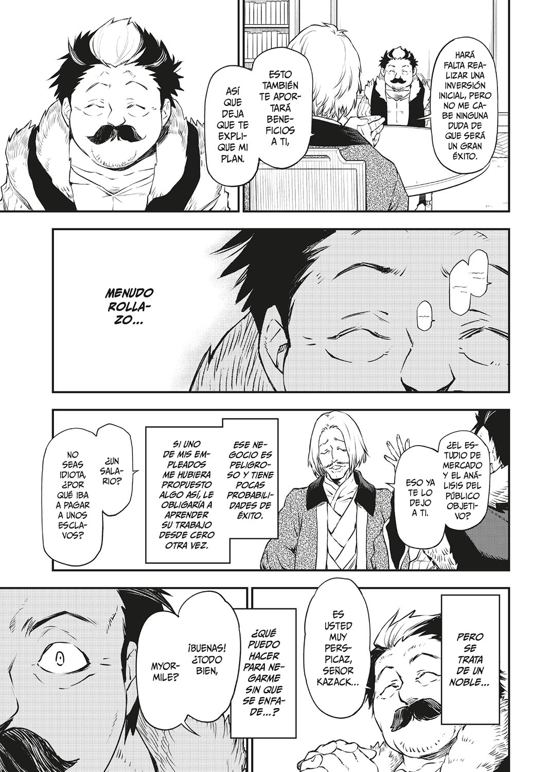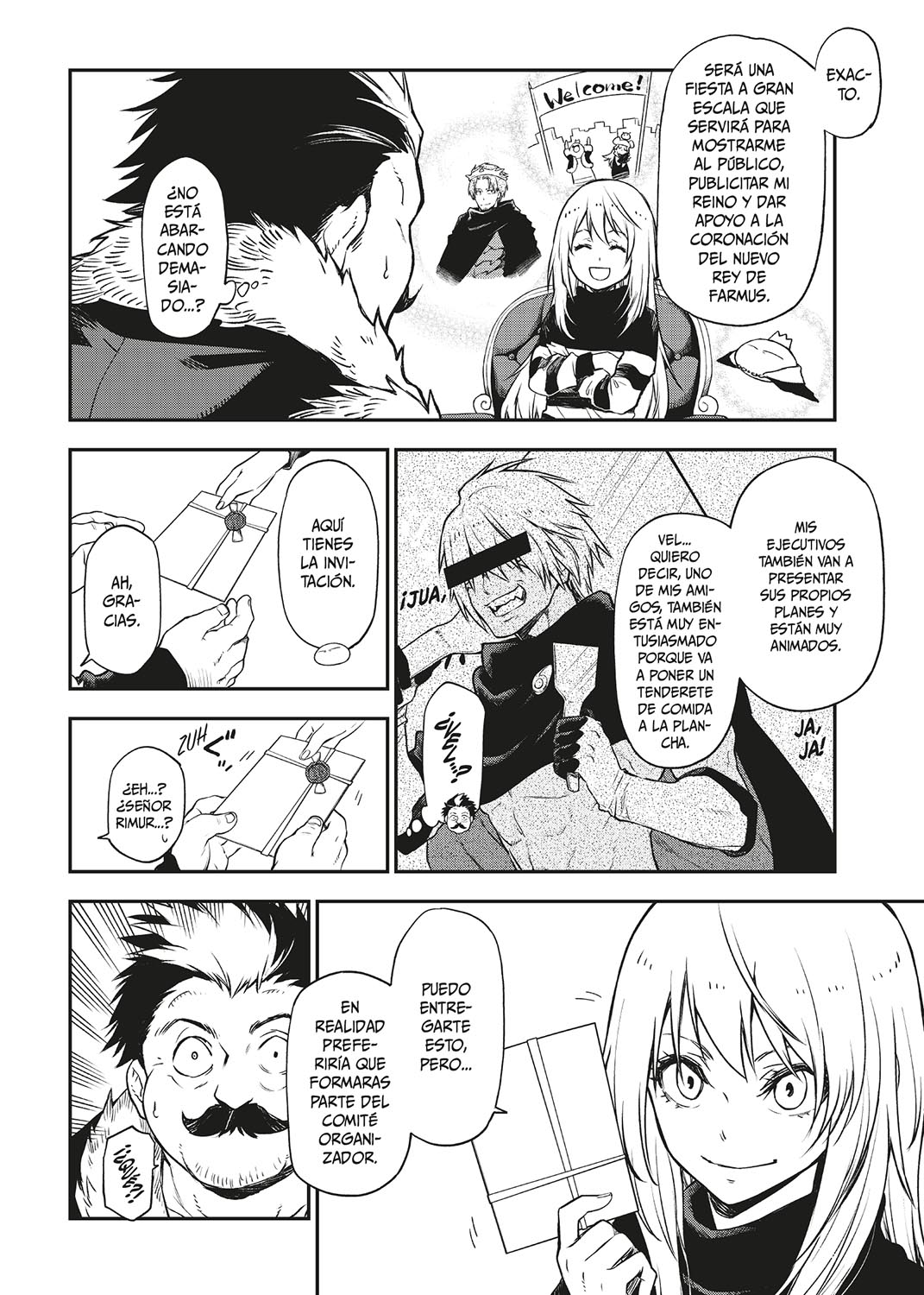 Rimur se va a presentar como rey de los demonios y ha decidido aprovechar para organizar una fiesta de apertura. Ahora que ha arreglado sus diferencias con Hinata, las preparaciones avanzan a pasos agigantados, y ha visitado a Myormile, el mercader de Brumund, para negociar con él en persona y planificar los espectáculos de la fiesta. ¿Qué forma tomarán sus maquinaciones?