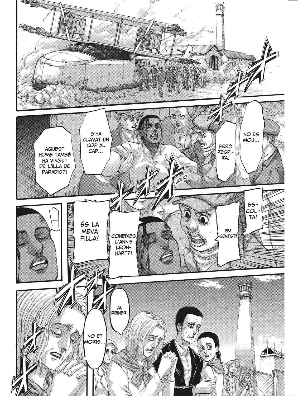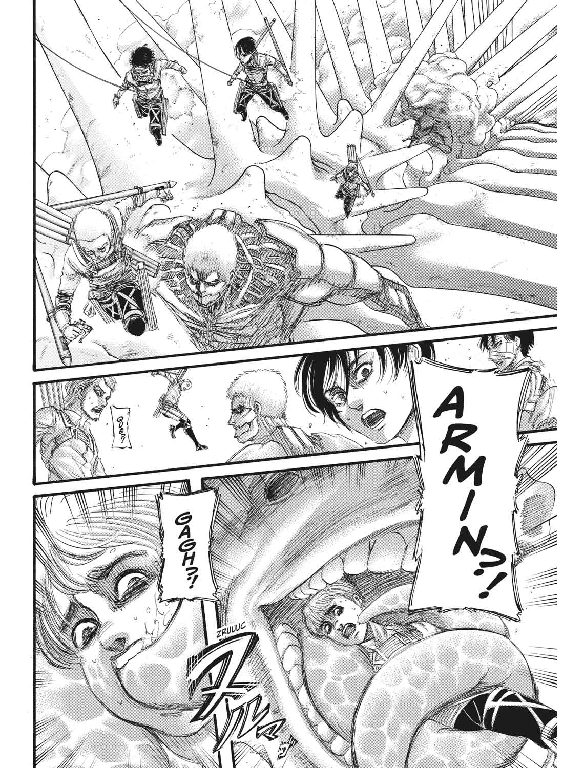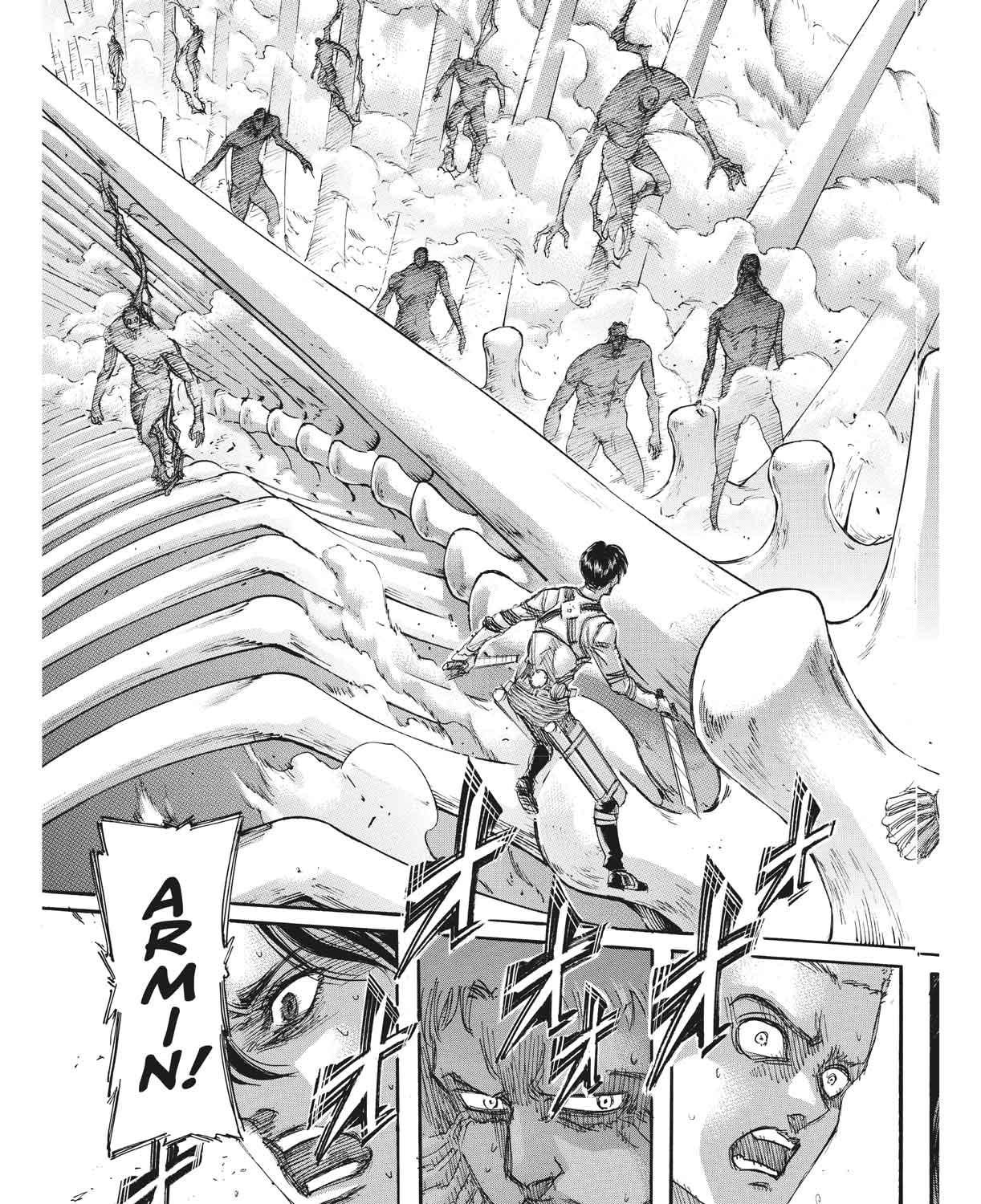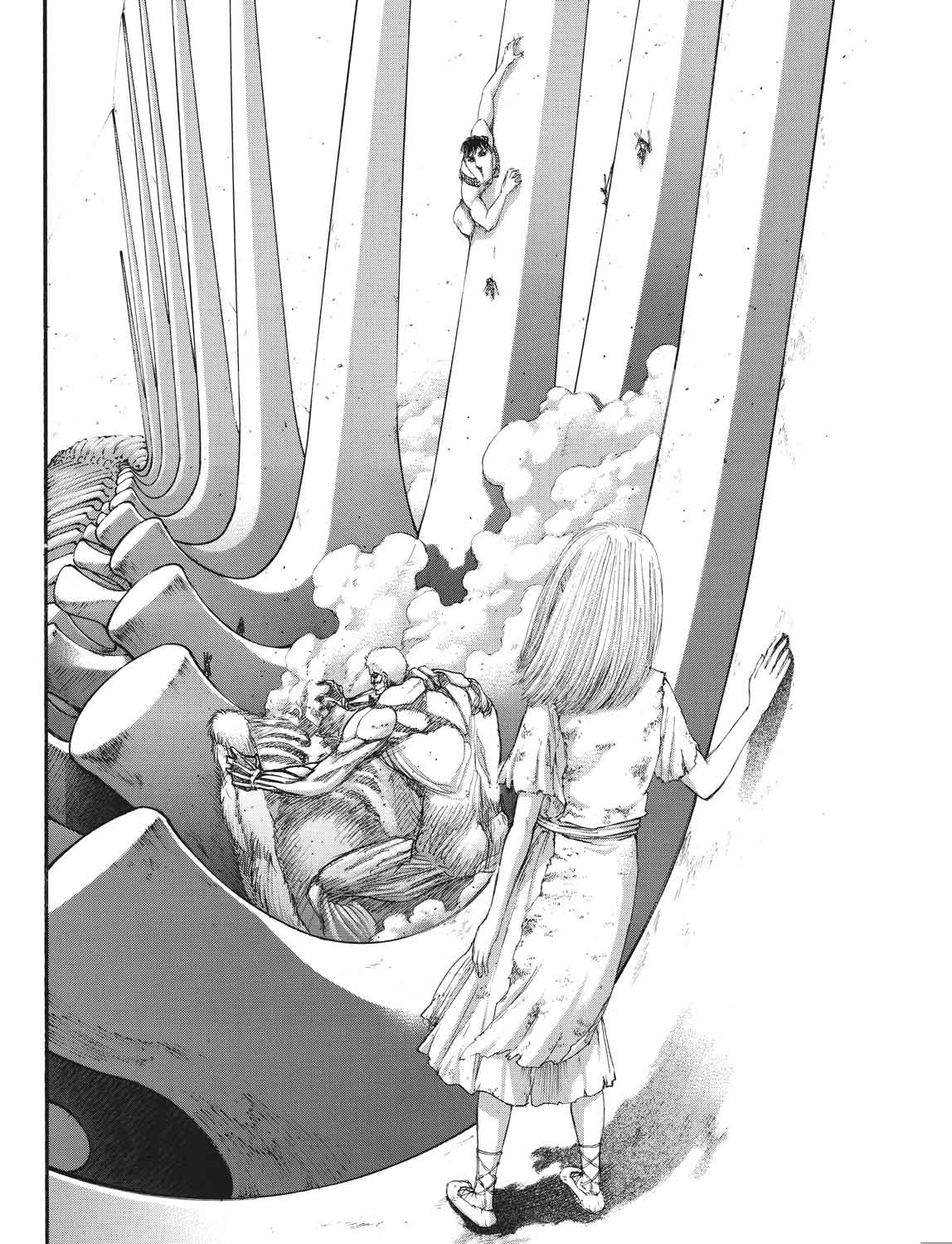 El Retró va esclafant tota la terra, a excepció de l’illa Paradis, i va arrabassant vides, una darrere l’altra. Armin, Mikasa i els altres han esbrinat quin és l’objectiu de l’atac d’Eren i, malgrat que, entre enemics, aliats i antics companys, estan perdent moltíssima gent, per fi arriben a Eren.