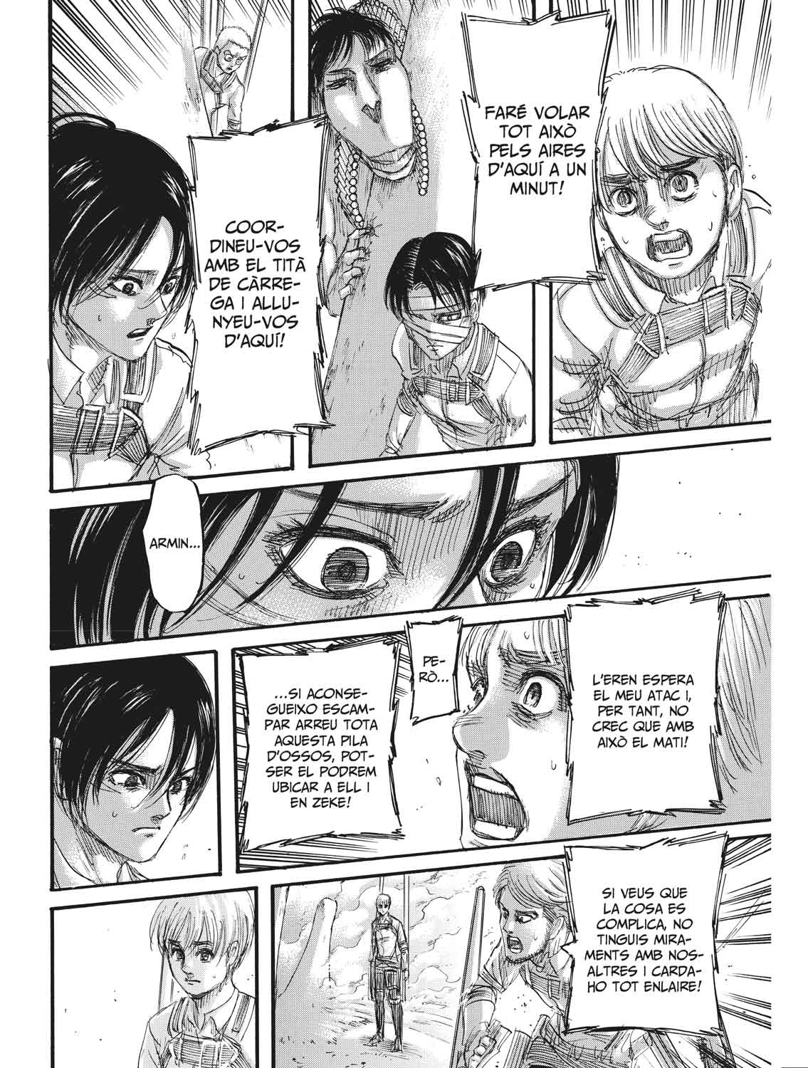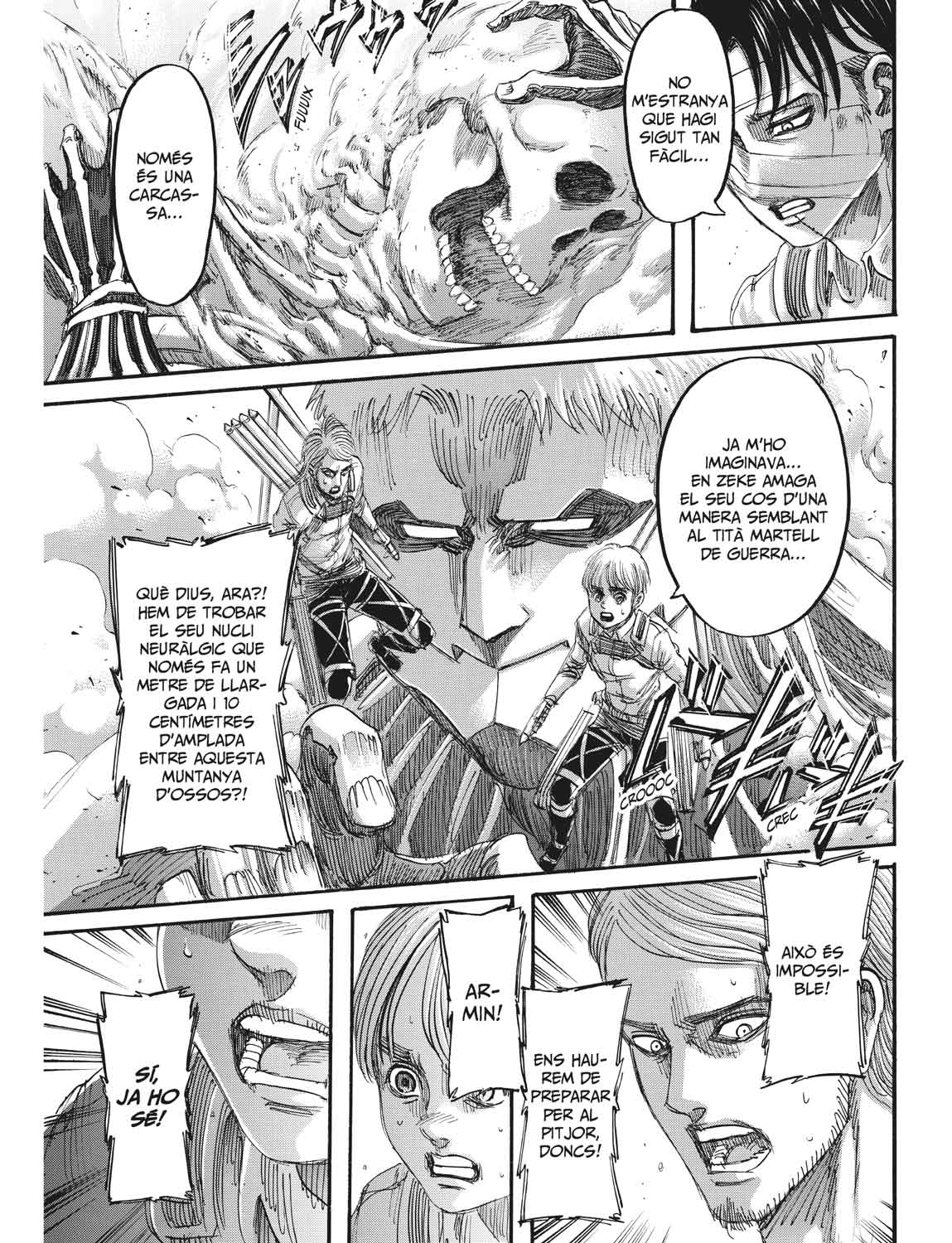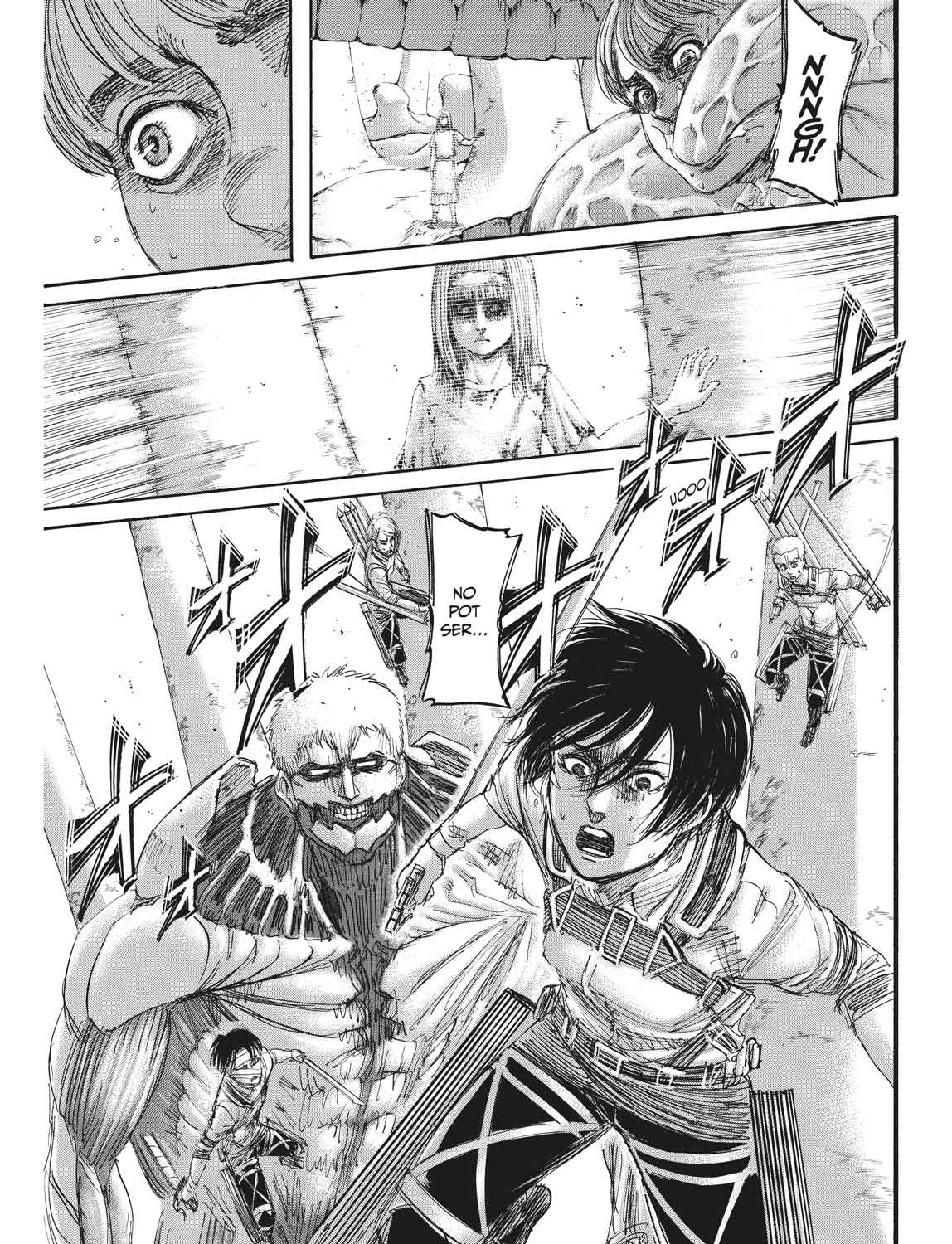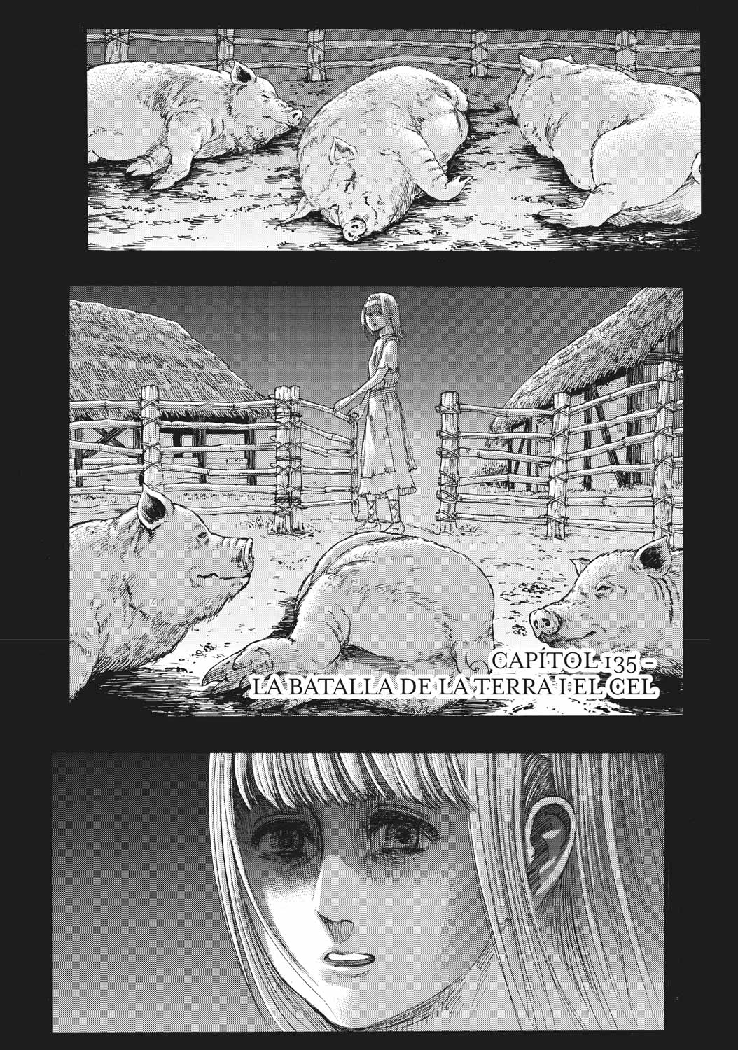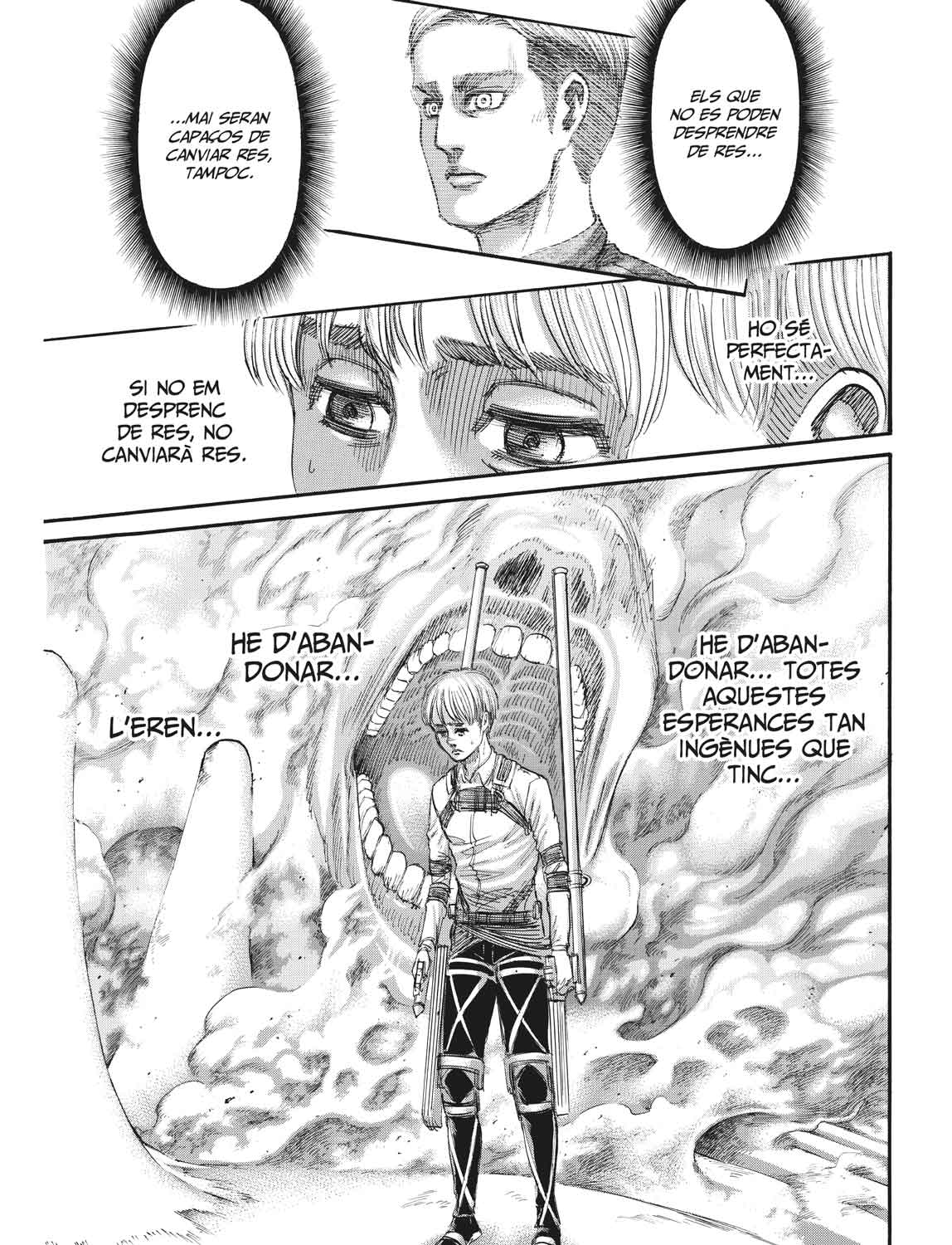 El Retró va esclafant tota la terra, a excepció de l’illa Paradis, i va arrabassant vides, una darrere l’altra. Armin, Mikasa i els altres han esbrinat quin és l’objectiu de l’atac d’Eren i, malgrat que, entre enemics, aliats i antics companys, estan perdent moltíssima gent, per fi arriben a Eren.
