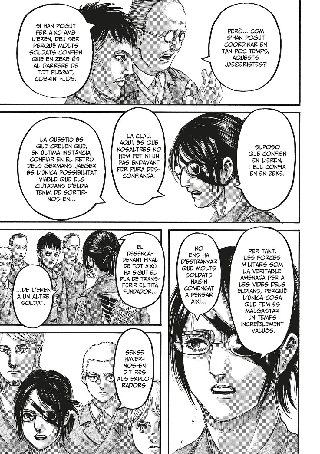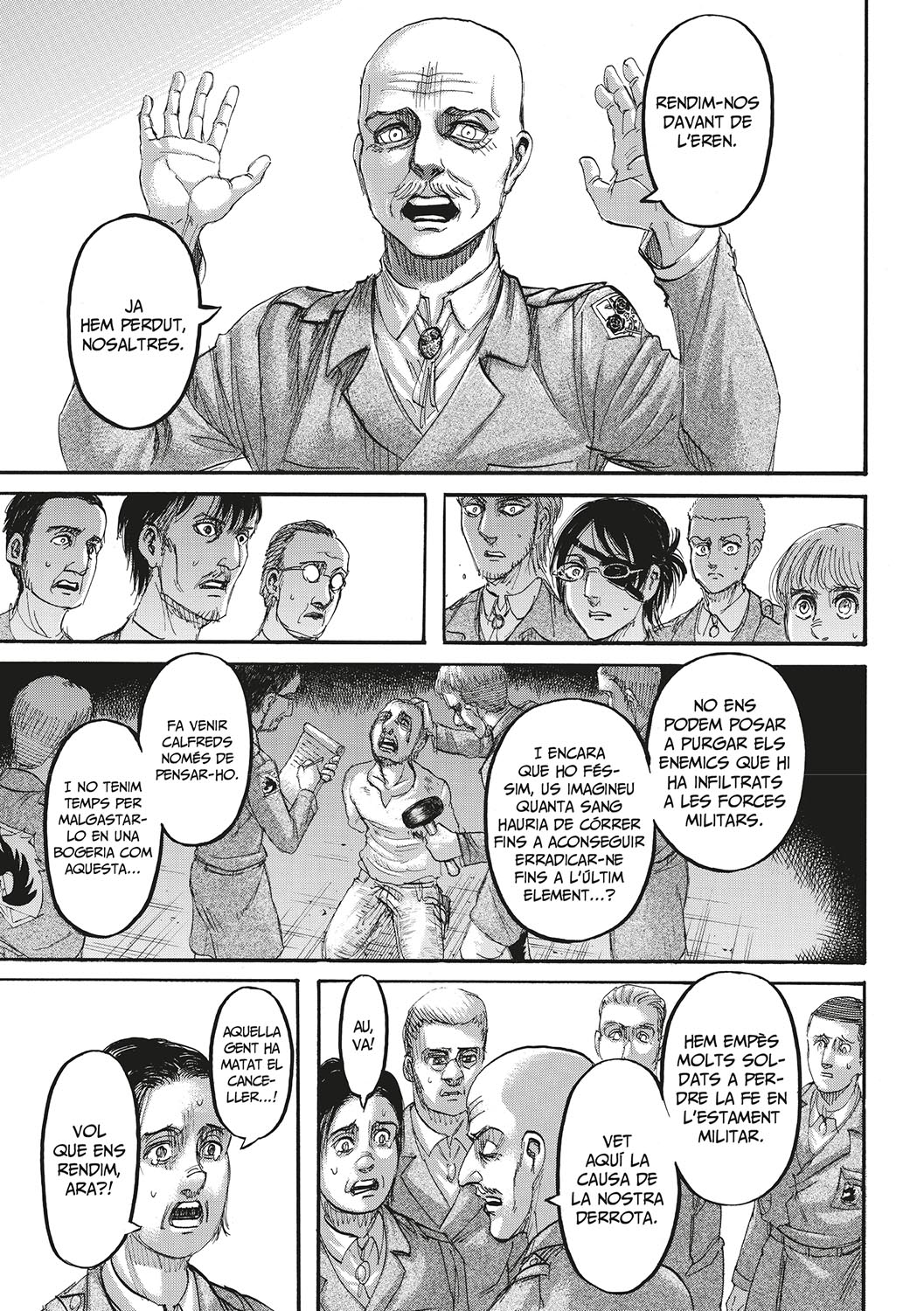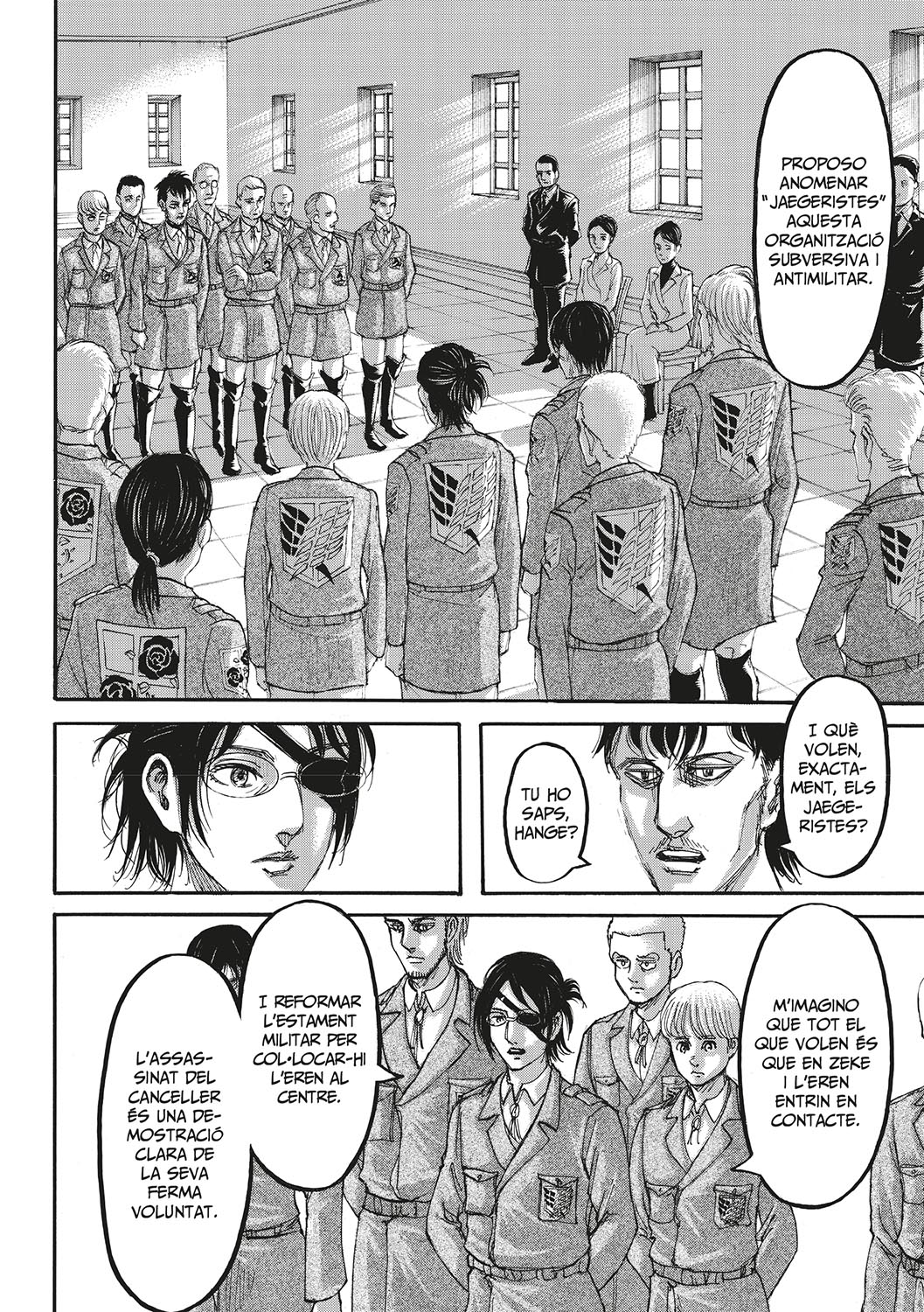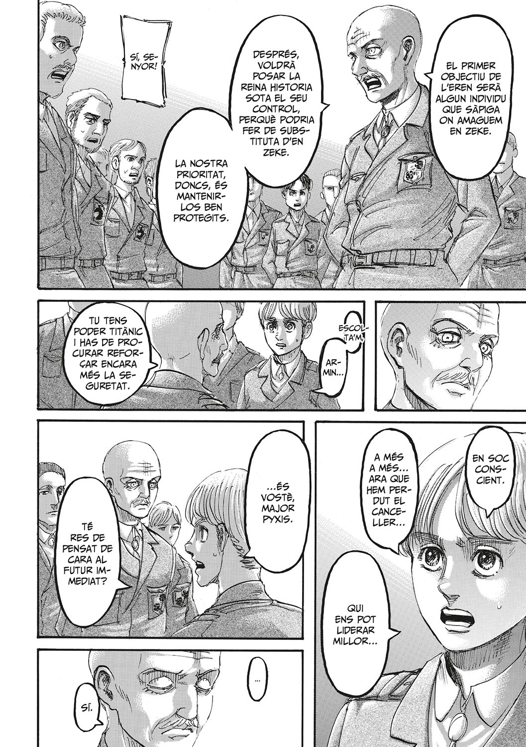 Només la sang de la reialesa pot aconseguir que s’activi el retrò i ara que l’Eren i el Zeke estan junts podrien fer-ho, però val la pena assumir aquest risc? L’exèrcit sospita que Zeke pot manipular a l’Eren, però van ben equivocats. Tal com diu l’Eren “jo soc un home lliure” i tot fa sospitar que l’Eren actuarà segons els seus interessos.