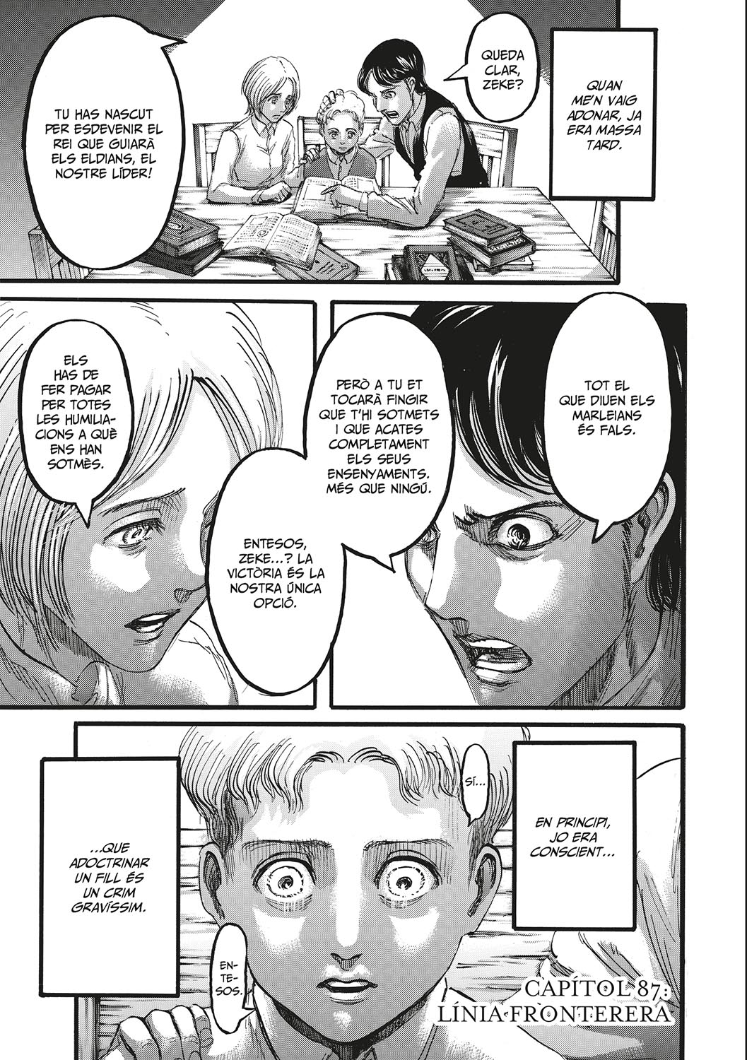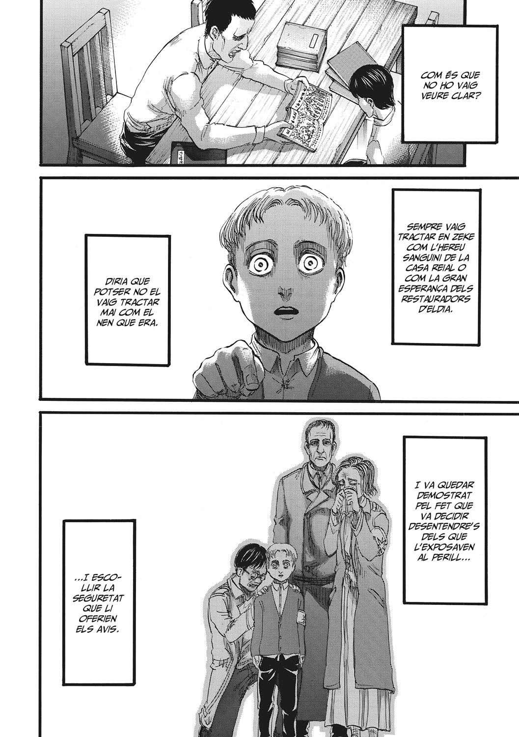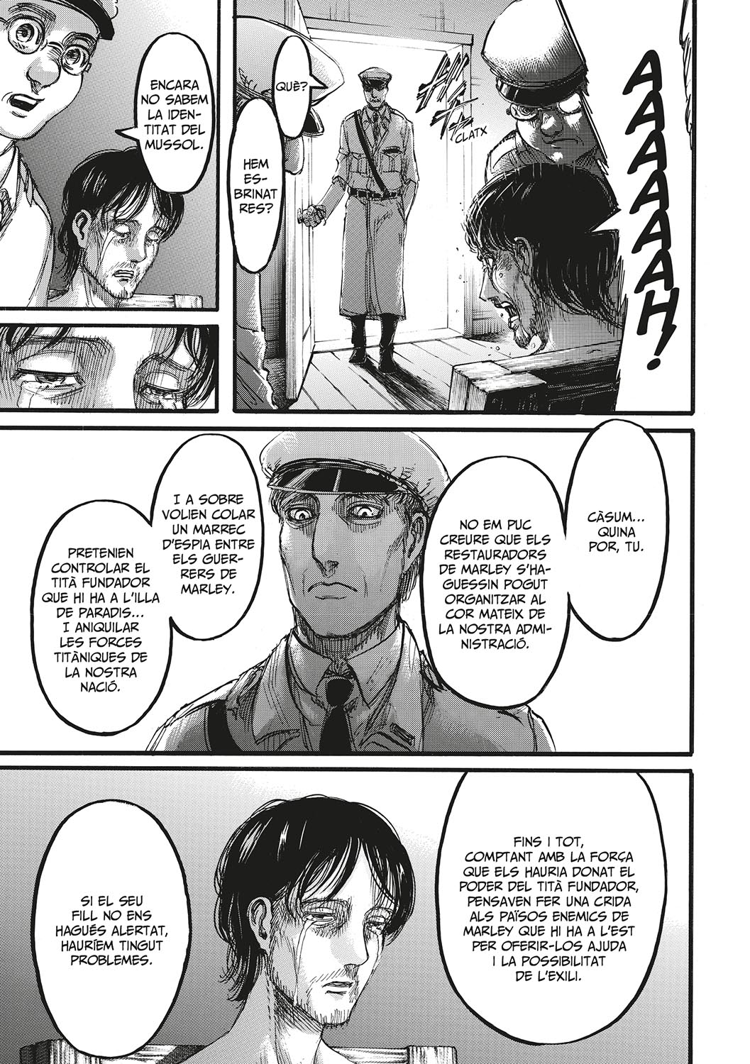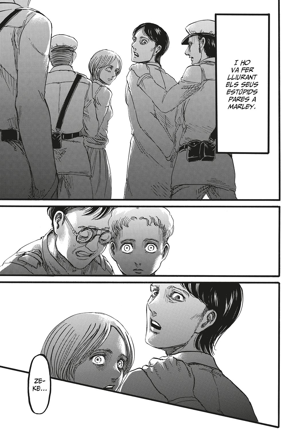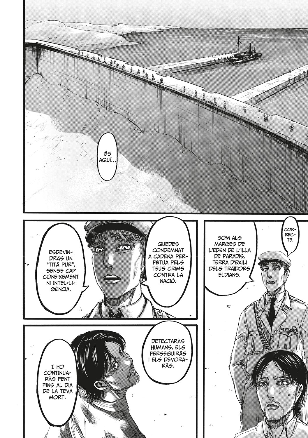 Després de la terrible batalla contra els titans, especialment contra el tità animal, el cos d’exploració arriba a la casa natal d’Eren, però el secret que s’amaga al soterrani no és pas el que s’esperaven. Quin camí hauran de seguir davant de la veritat del món que se’ls ha revelat?