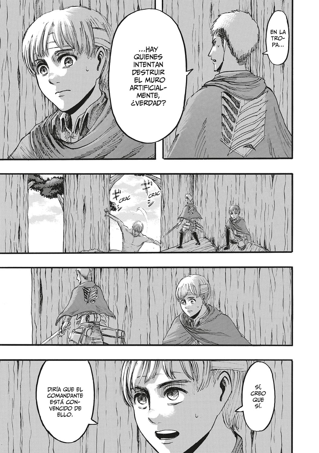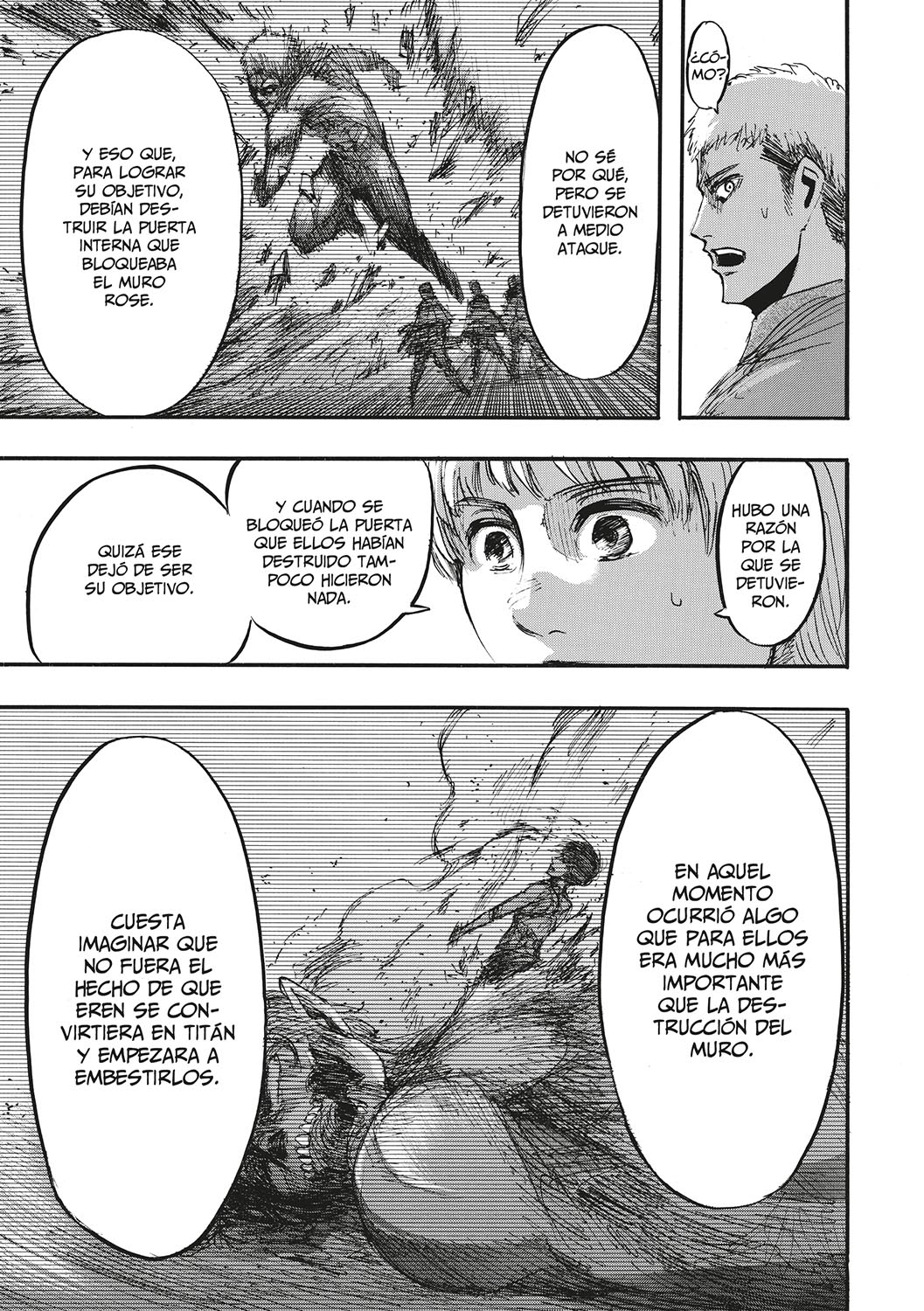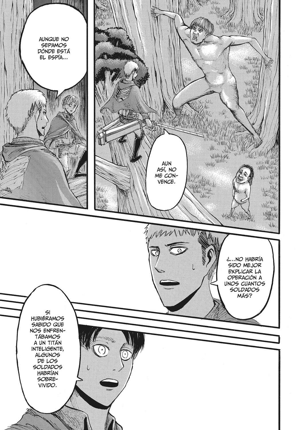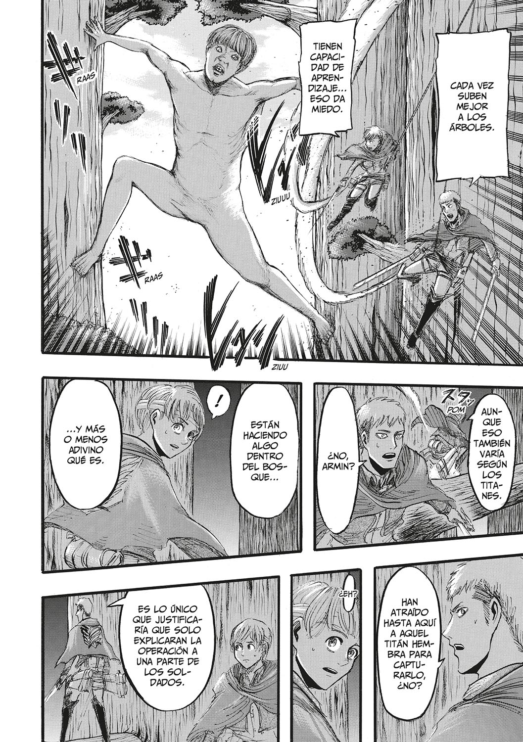 La habilidad de Eren para convertirse en titán llena de esperanza a los soldados y les da un nuevo impulso para seguir adelante y combatirlos. Pero este rayo de esperanza se solapa con un nuevo descubrimiento: un titán hembra inteligente. Si la inteligencia era la baza principal con la que los soldados podían combatir a los titanes ¿cómo podrán hacerles frente ahora que descubren que hay un titán que también la tiene? y ¿quién se esconde detrás de ese titán hembra?