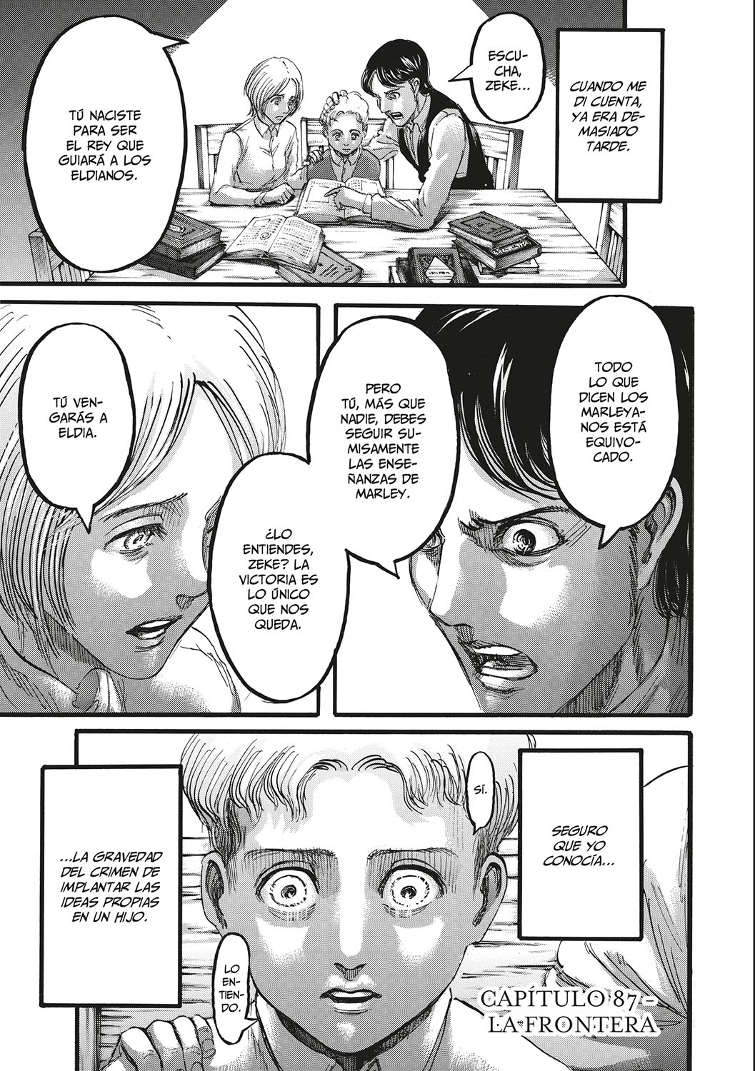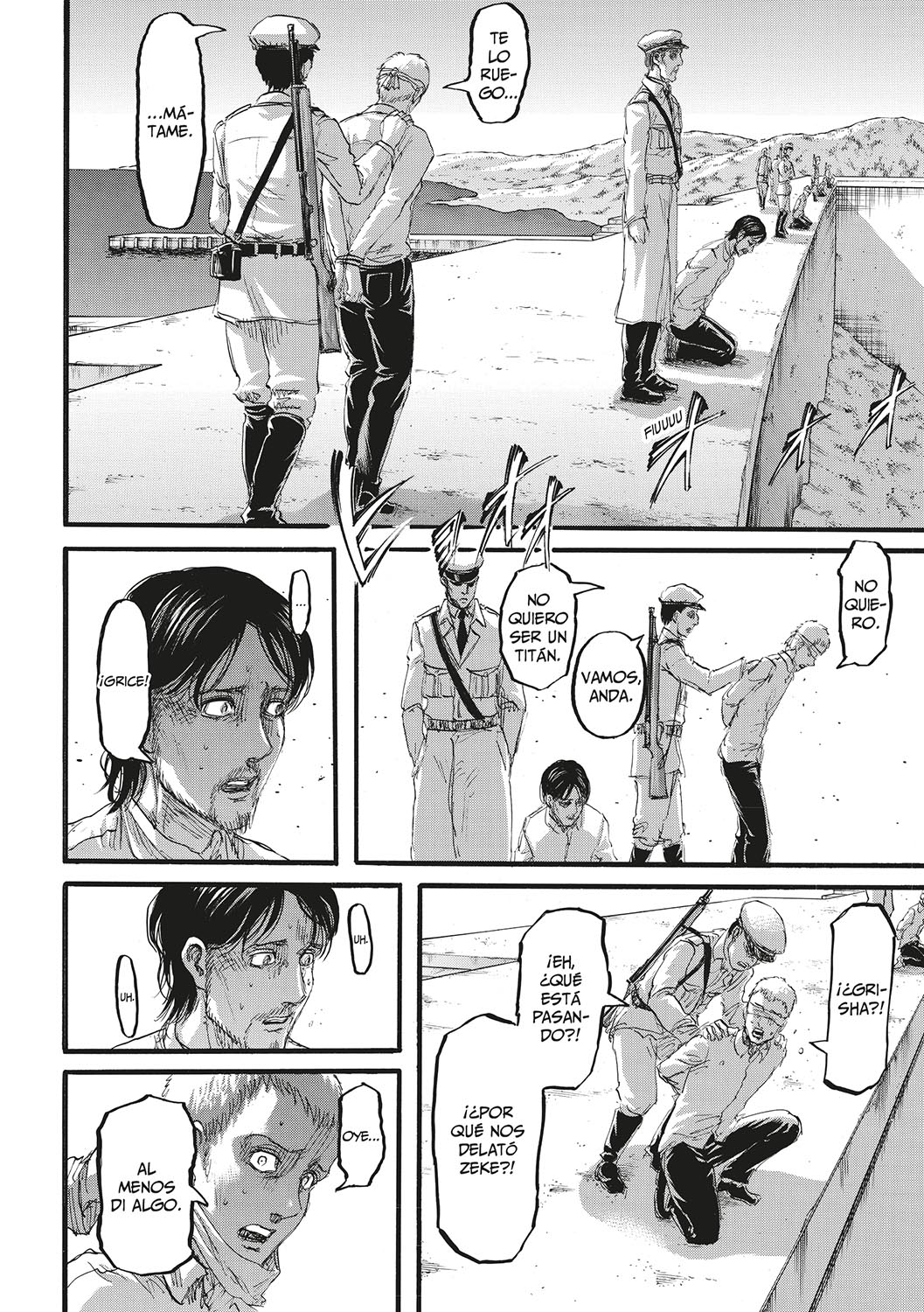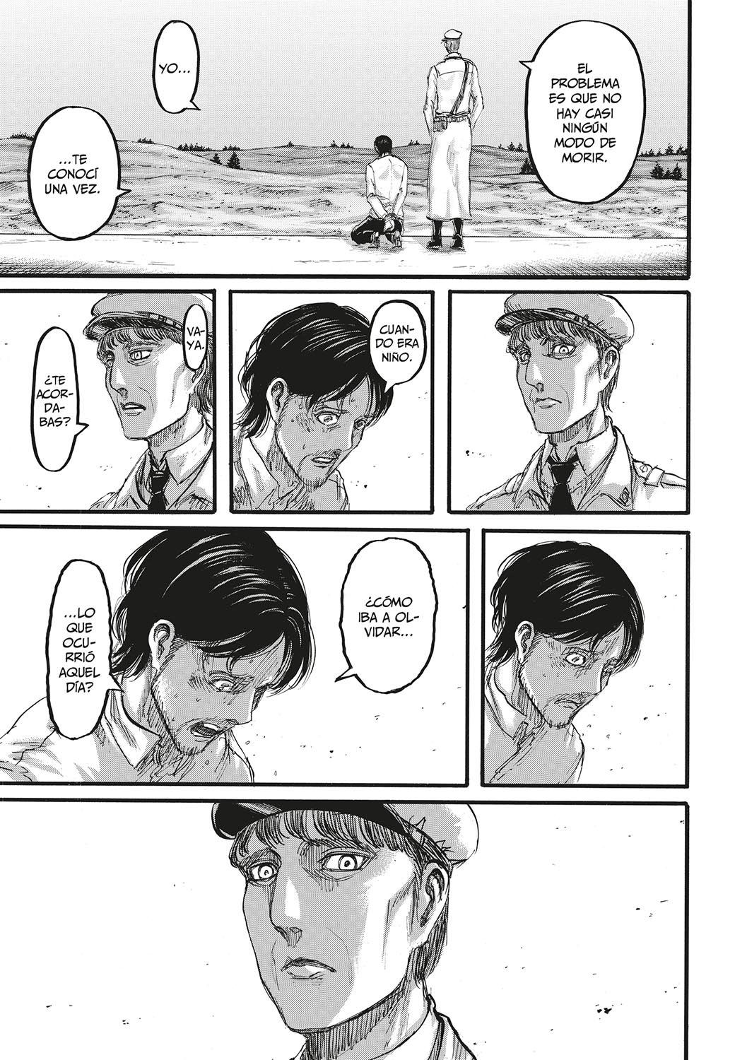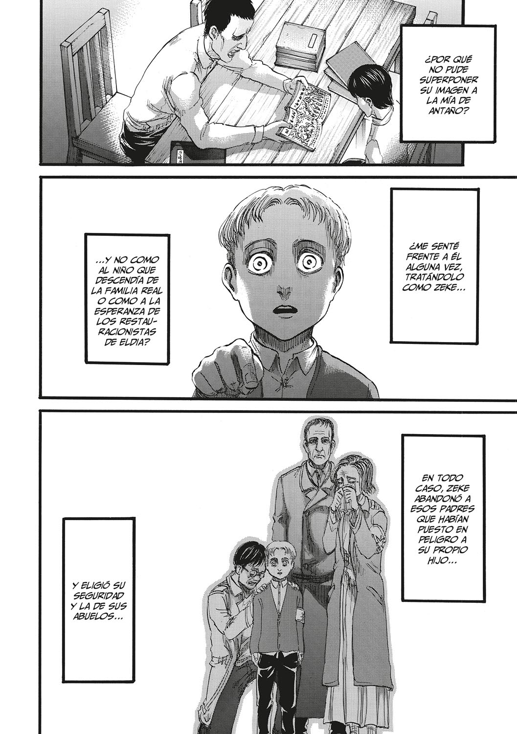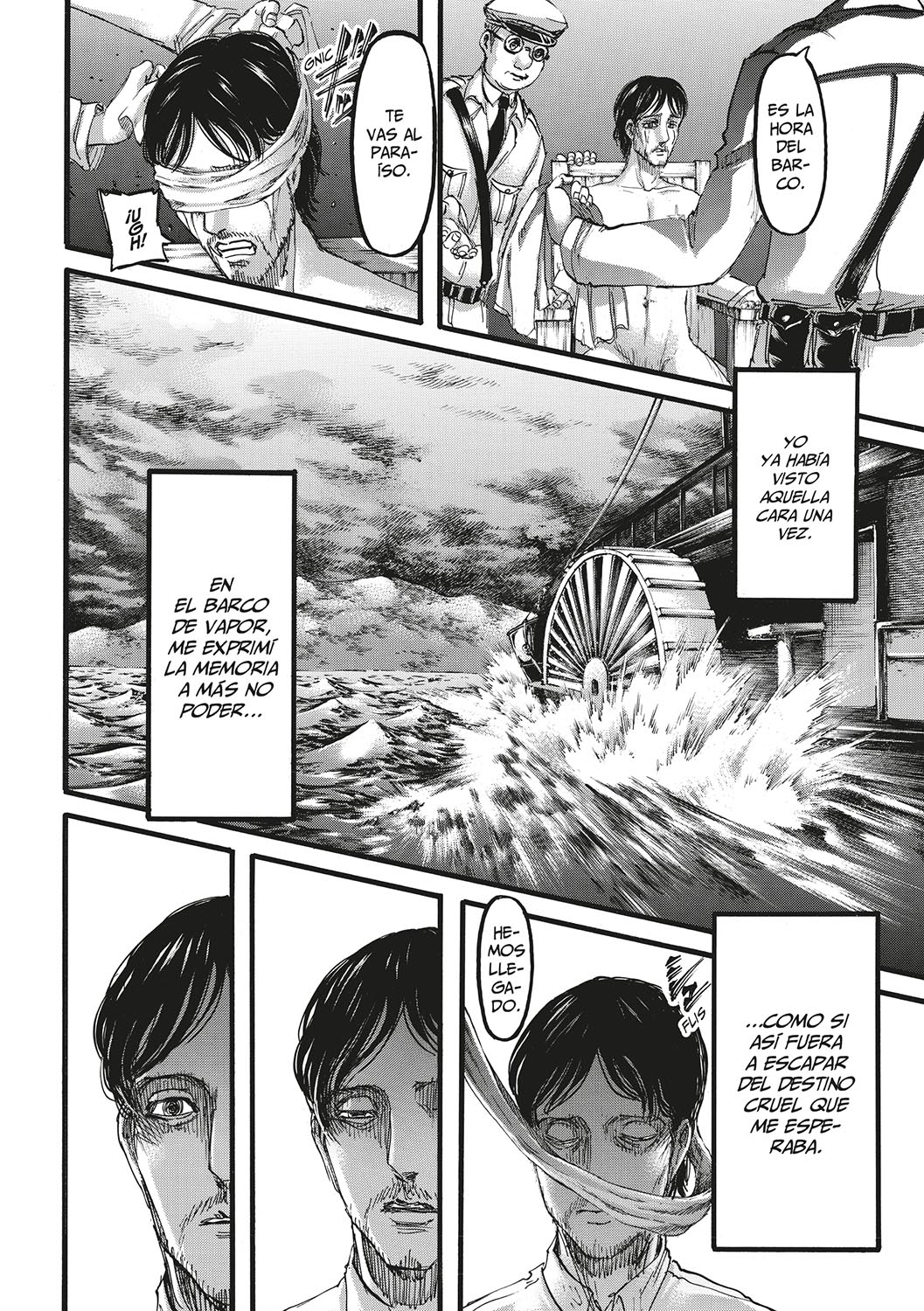 Tras la terrible batalla contra los titanes, en especial contra el titán animal, el cuerpo de exploración llega a la casa natal de Eren, pero el secreto que se oculta en el sótano no es en absoluto lo que se esperaban. ¿Qué camino deberán seguir ante la verdad del mundo que se les ha revelado?