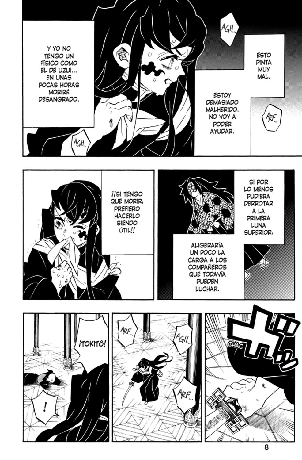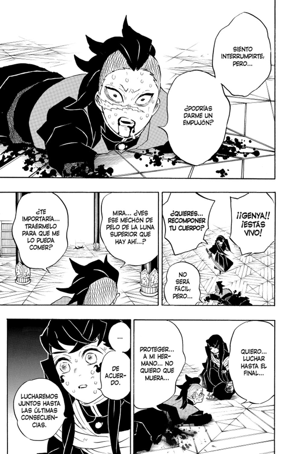 Los pilares Himejima y Shinazugawa se enfrentan a la primera Luna superior. En el transcurso de la pelea, ambos desarrollan las marcas en su piel, pero ni estas ni su coordinación en el ataque son suficientes para hacer sombra al abrumador poder del enemigo. Sin embargo, cuando todo parece perdido, Genya se recupera absorbiendo una parte de la primera Luna... ¡¿Cuál será el desenlace de esta cruenta batalla...?!