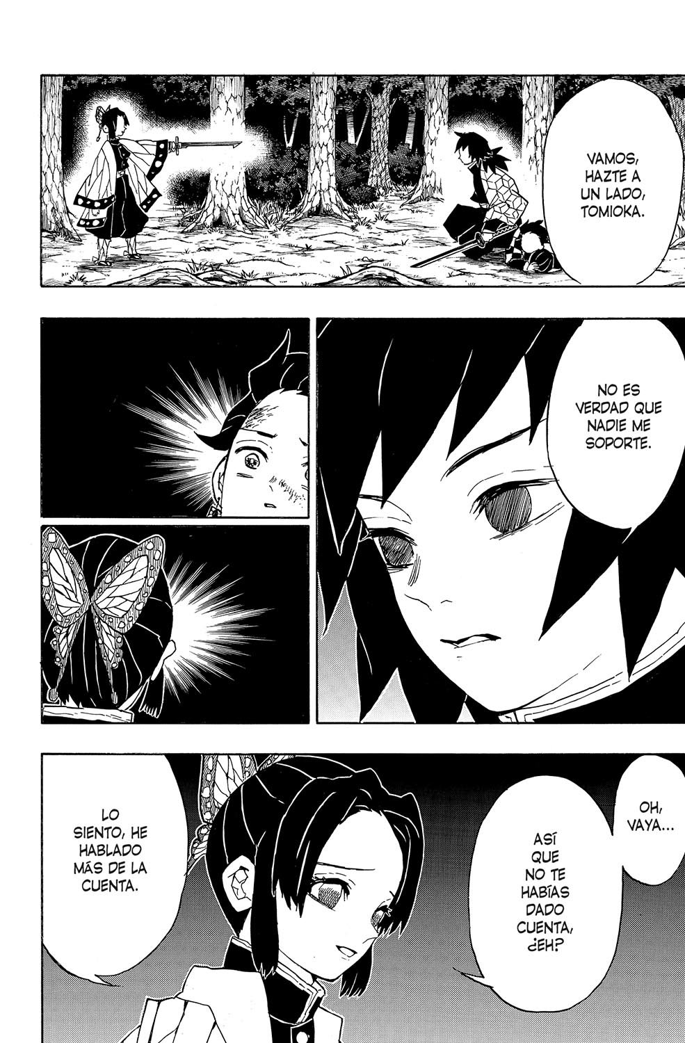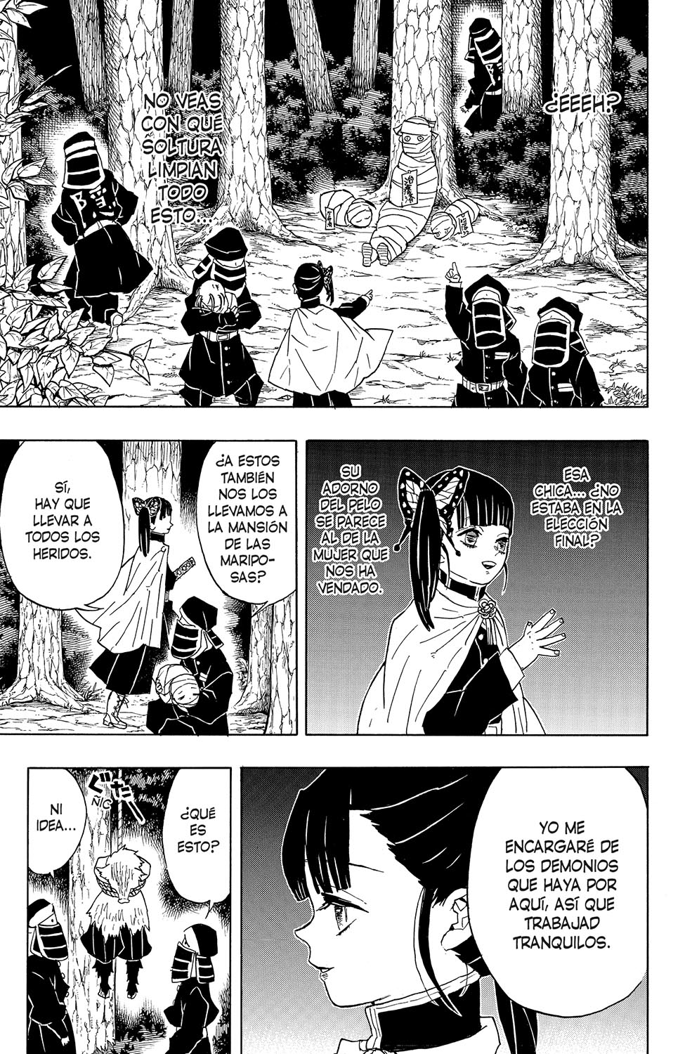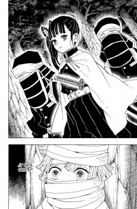 Tanjirô logra vencer por los pelos al demonio araña, pero entonces Shinobu Kochô, también miembro del Cuerpo de Matademonios, aparece para dar caza a Nezuko, lo que desencadena una refriega que se acaba saldando con la captura de los dos hermanos. Tanjirô despierta en el cuartel general del Cuerpo rodeado por los "pilares", la élite de los espadachines matademonios, quienes se disponen a juzgarlo por haber infringido las normas llevando a un demonio consigo...