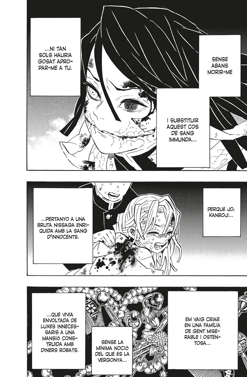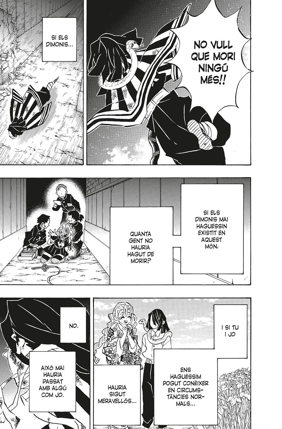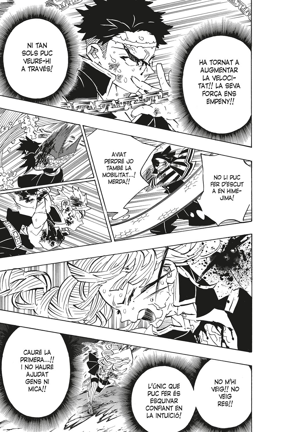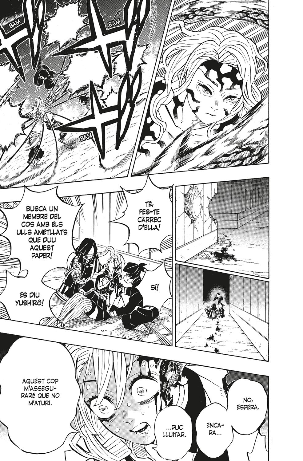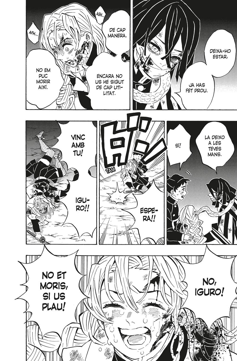 Encara falta més d’una hora perquè surti el sol i en Muzan es mostra cada cop més ferotge lluitant. Els pilars que es mantenen dempeus es llancen a atacar-lo, però no els és gens fàcil tocar-lo amb l’espasa. Mentrestant, en Tanjirô continua abatut, víctima dels atacs d’en Muzan... Tothom s’esforça al màxim en una batalla que està arribant al límit!!