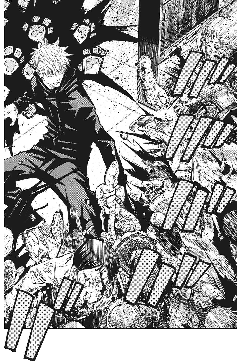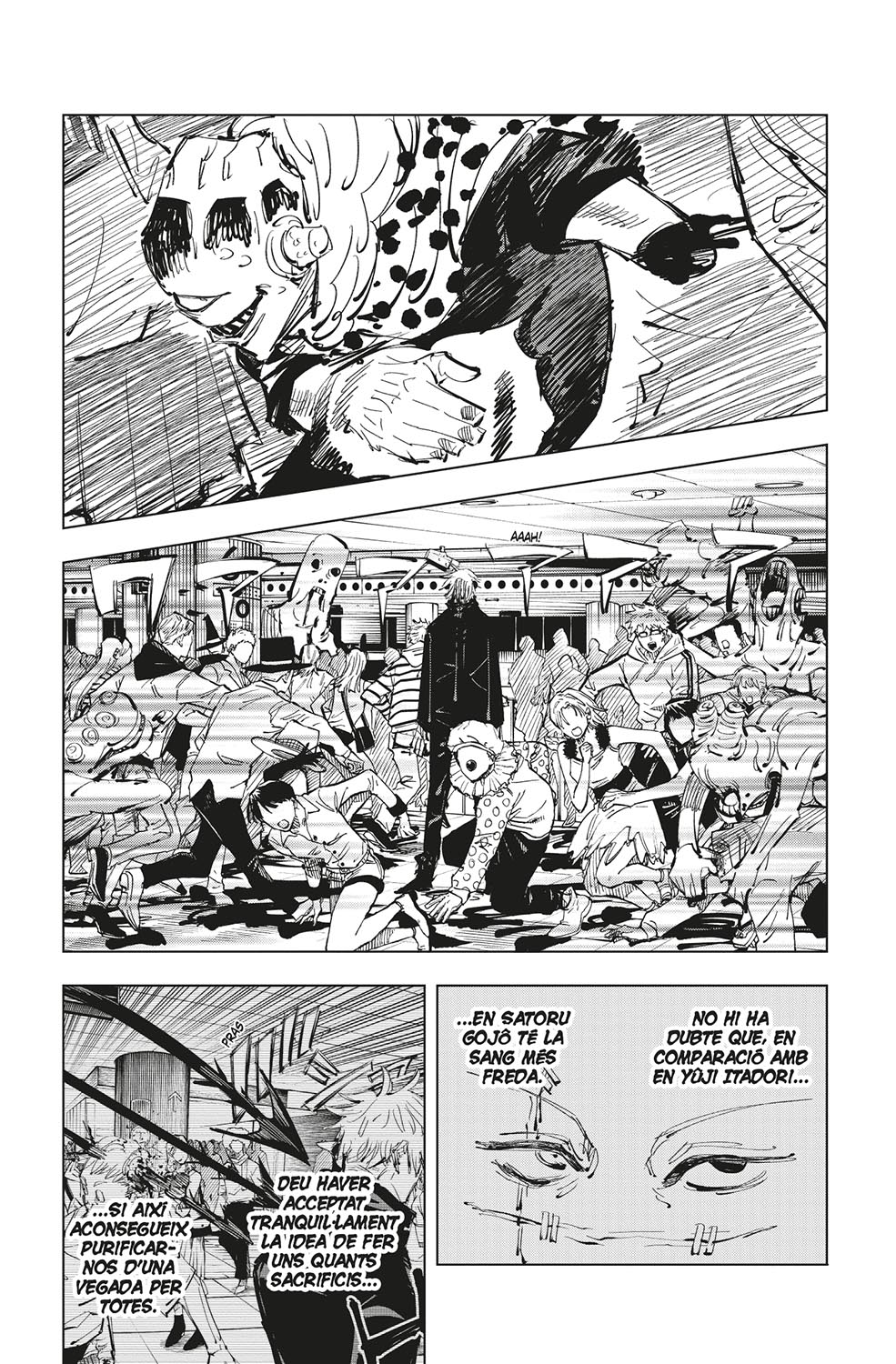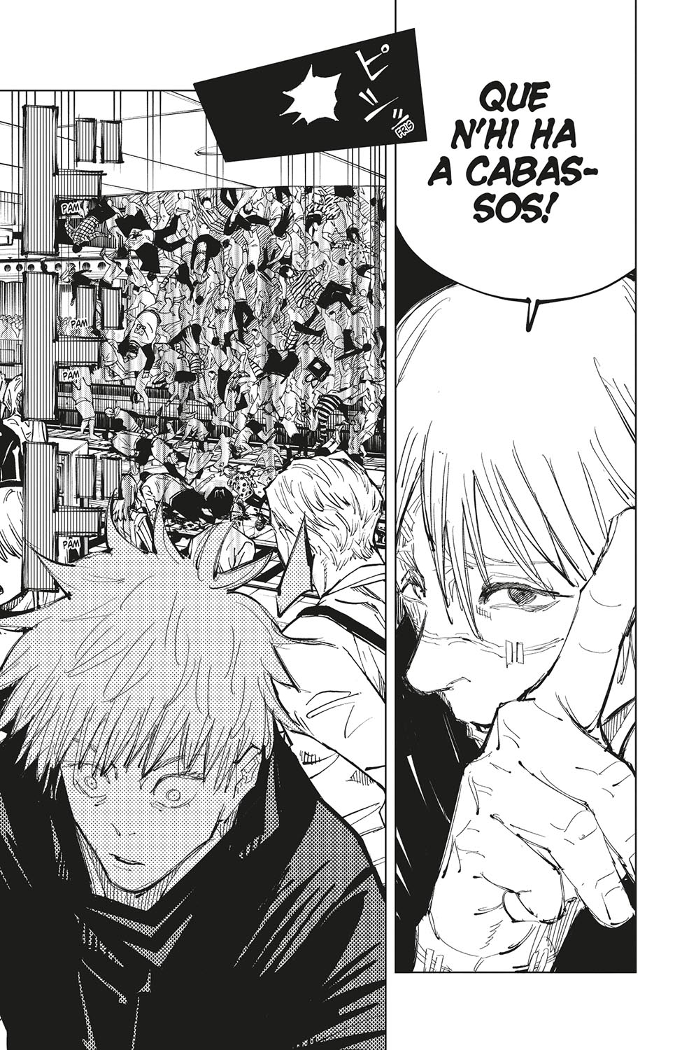 L’andana de metro de l’estació de Shibuya està abarrotada de persones normals i també d’humans modificats... Malgrat veure’s immers en aquesta situació terrible i sense escapatòria, en Gojô domina la lluita en tot moment i en fa passar de tots colors als esperits malignes. Però l’enemic encara té un as a la màniga: un atac pensat especialment per segellar en Gojô! Mentrestant, l’Itadori s’afanya a arribar a l’estació de Shibuya i, de camí, topa amb un aliat inesperat!