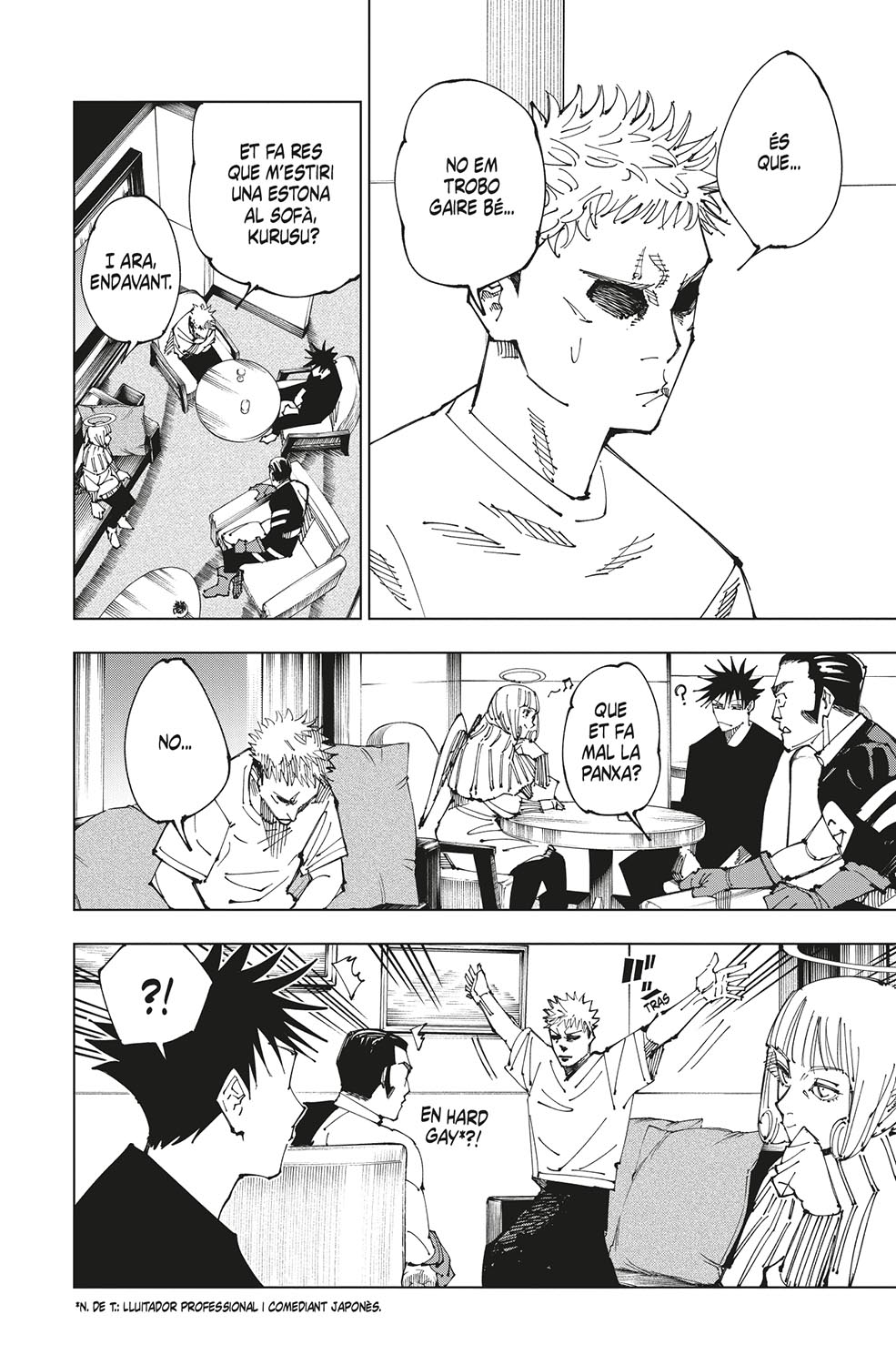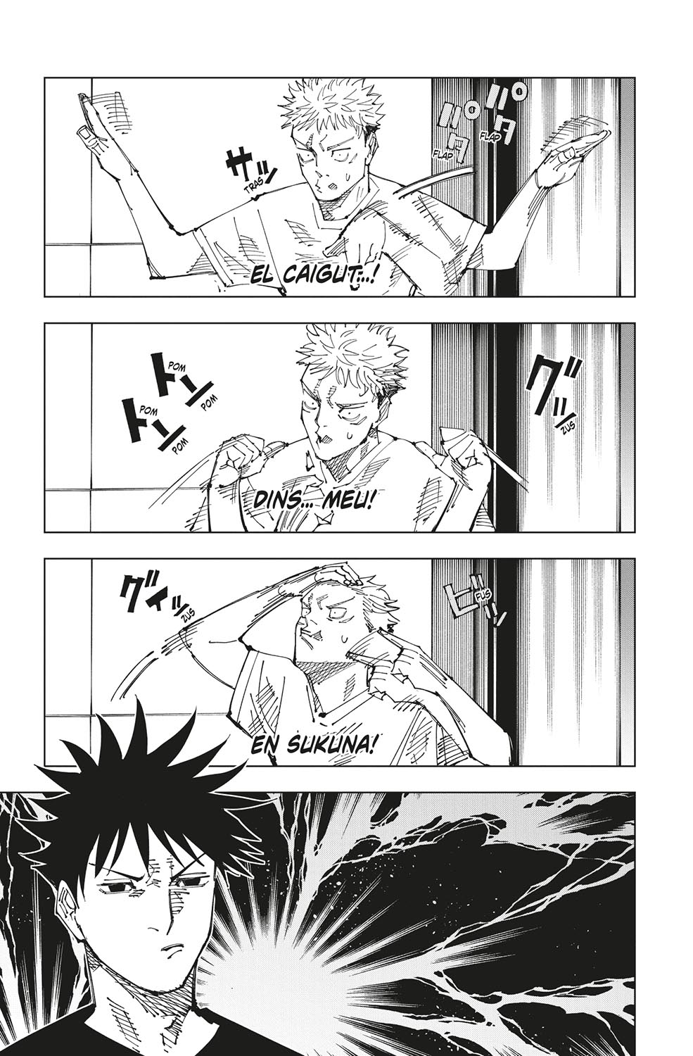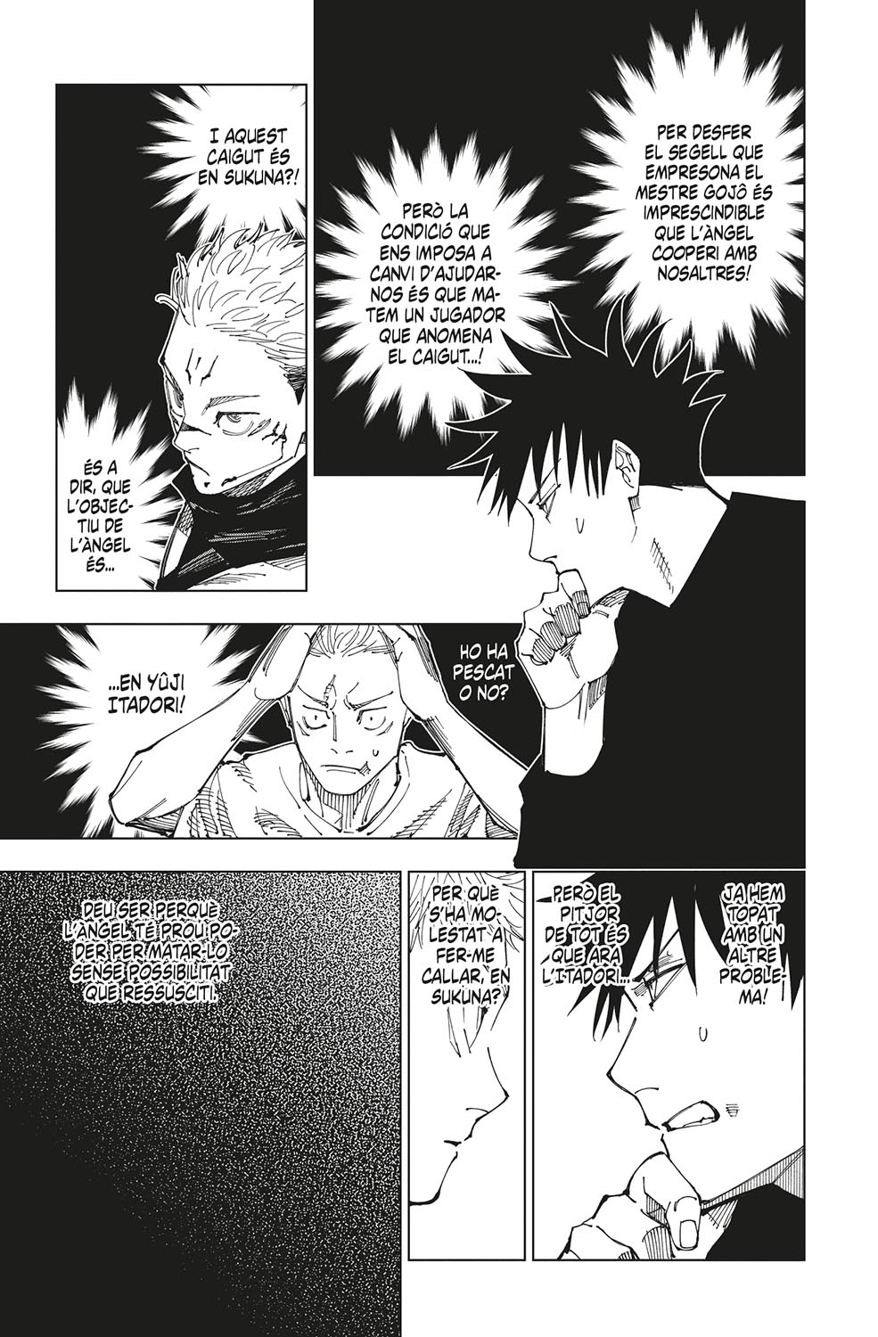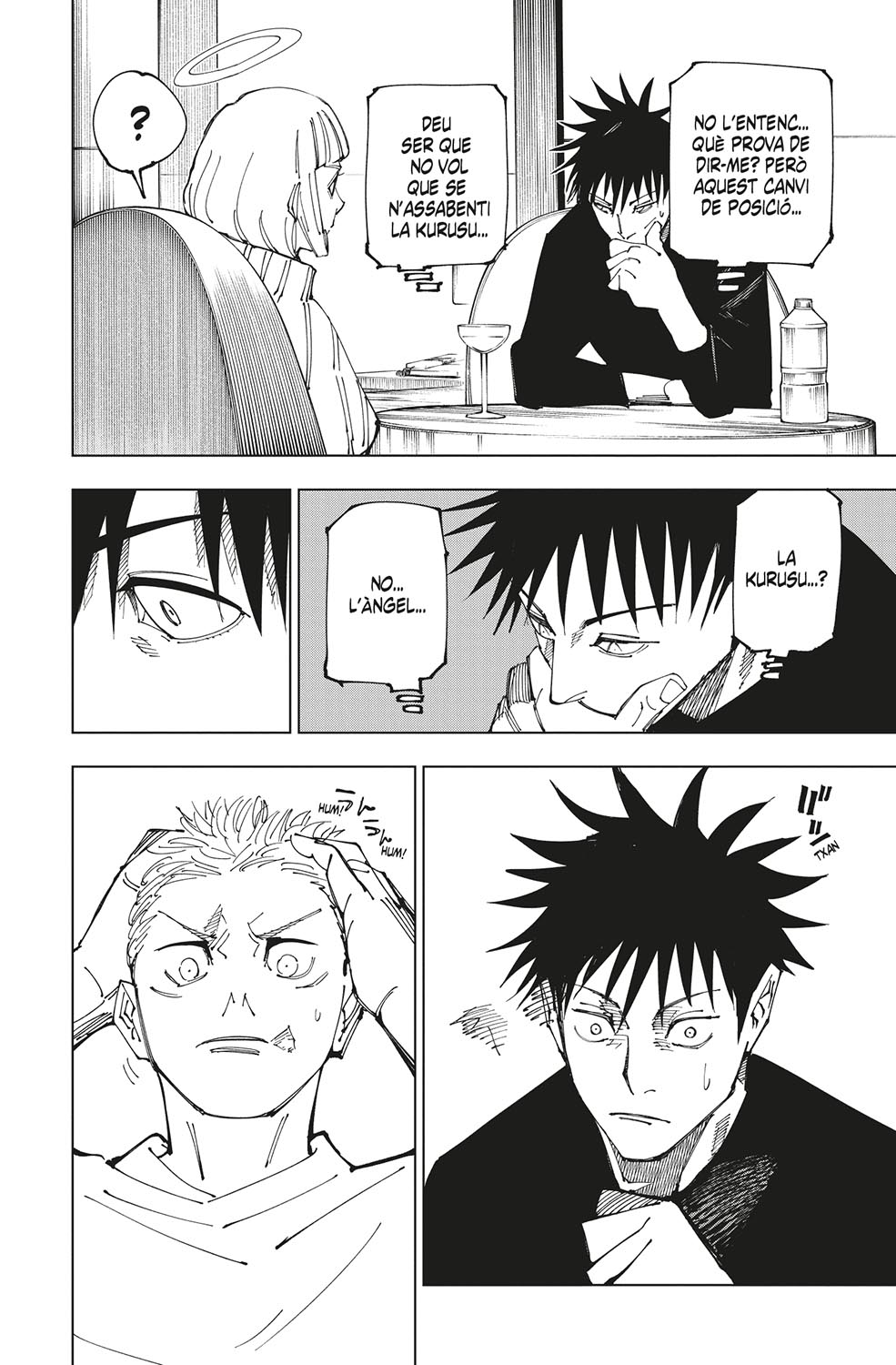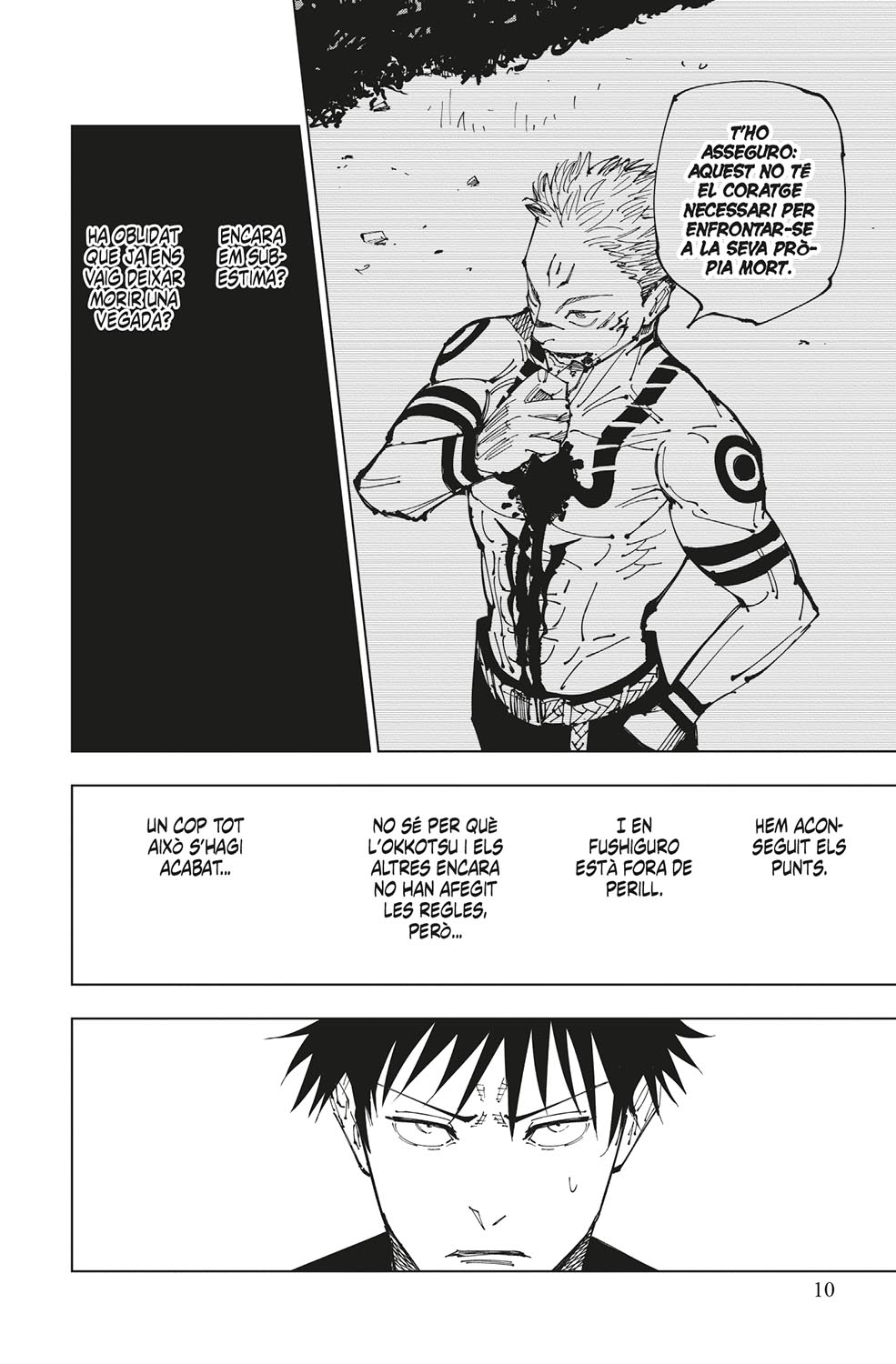 En Sukuna ha revelat que l’objectiu de l’Àngel, l’individu que ella va anomenar “el Caigut”, és ell mateix. L’Itadori i en Fushiguro no acaben de comprendre quina deu ser l’autèntica intenció d’en Sukuna en revelar-los aquesta informació i, abans que ho puguin esclarir, en Kenjaku desferma una nova onada de caos sobre el Joc de l’aniquilació... ja que ha estat conspirant contra diversos països! Per acabar-ho d’adobar, en Kenjaku arriba finalment fins al lloc on s’ha reclòs en Tengen... el Santuari dels Estels Morts!