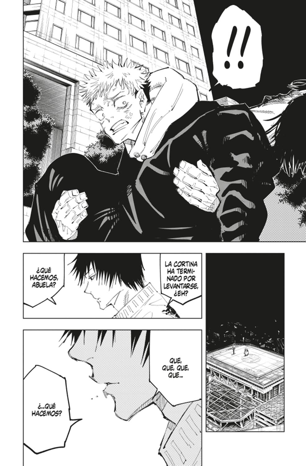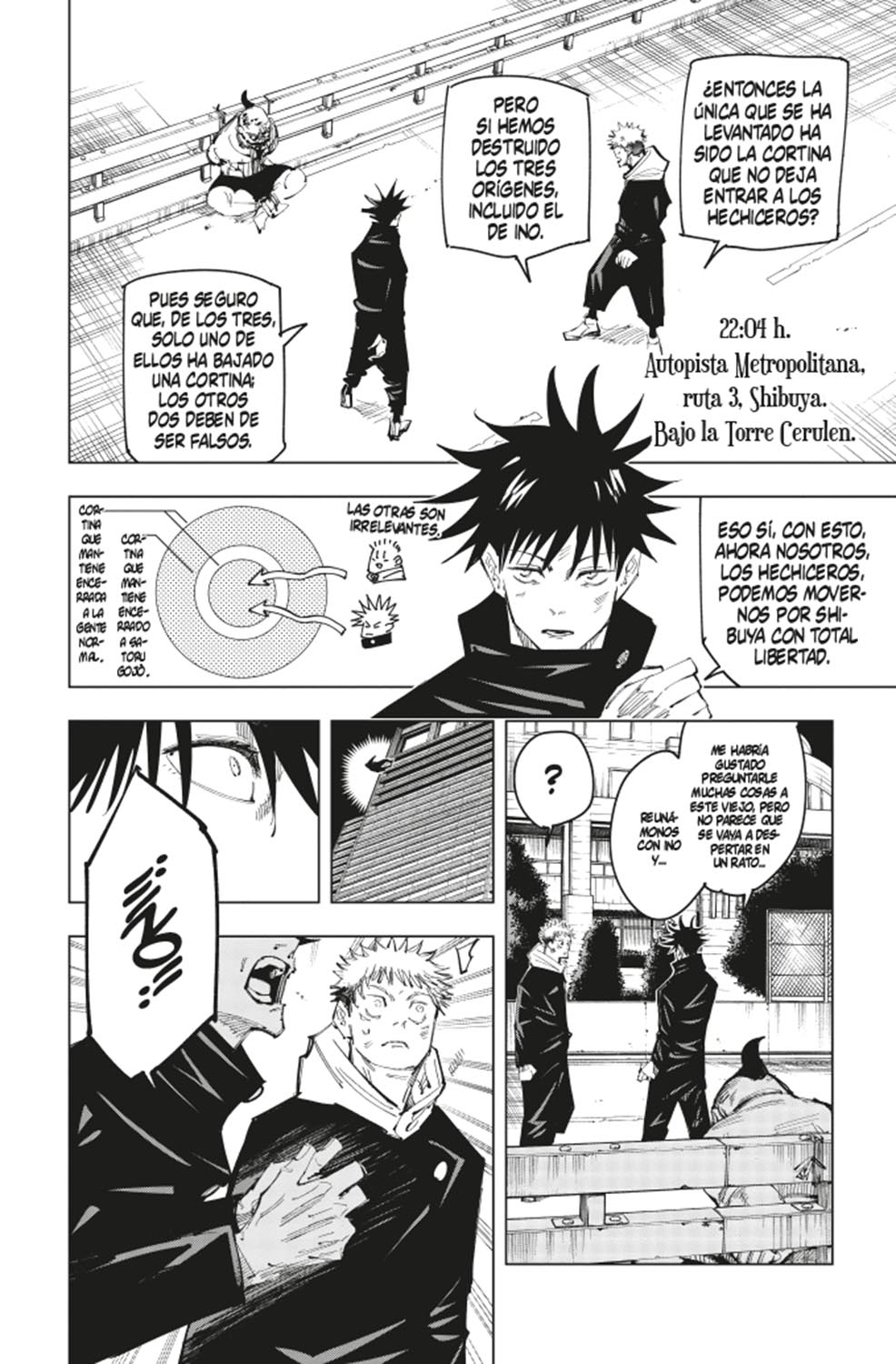¡La conexión con la muerte de Tôji Zen’in da un giro inesperado y el estado de confusión que reina por el incidente de Shibuya se intensifica todavía más! Mei Mei se acerca al andén del metro subterráneo y se encuentra con Getô… Por otra parte, Nanami está furioso ante el enorme daño sufrido por los supervisores ayudantes y Chôsô, el hermano mayor de las nueve etapas de la descomposición, intercepta a Itadori…