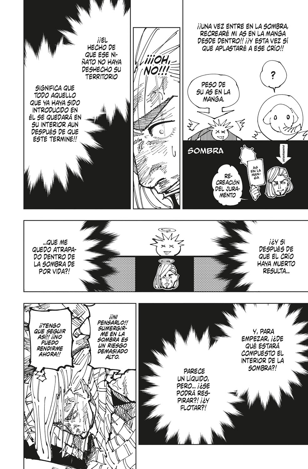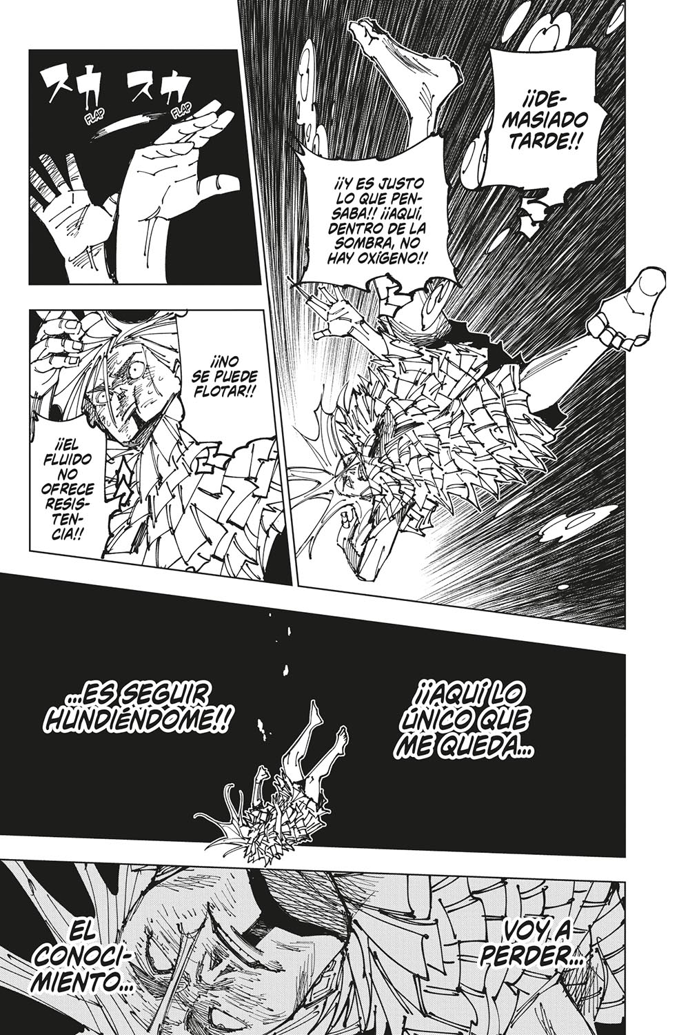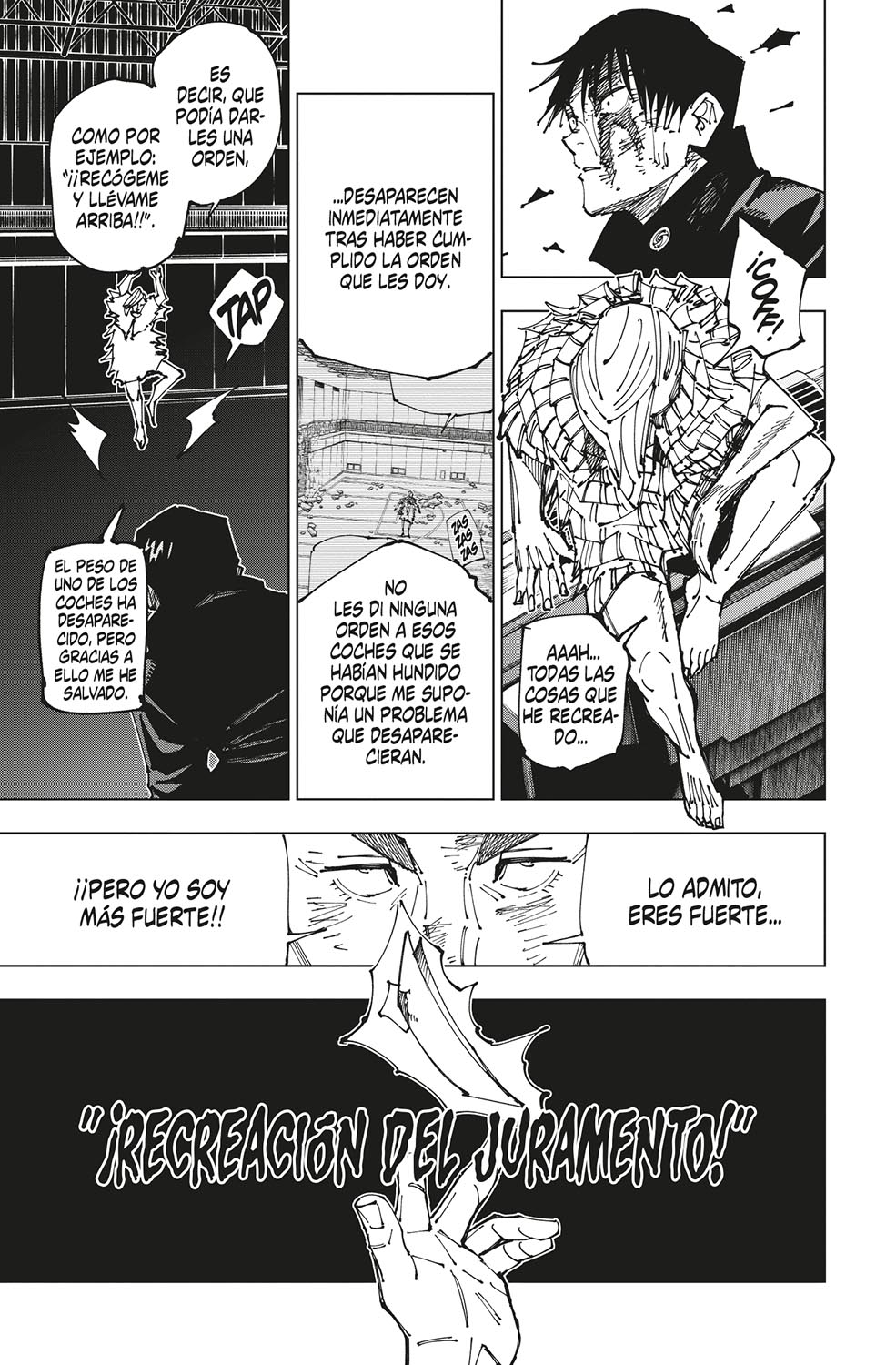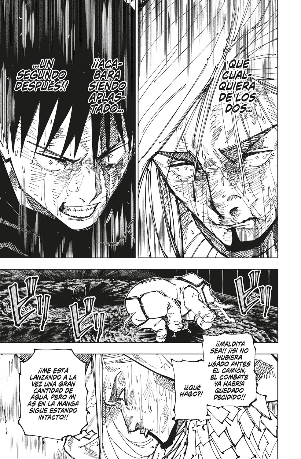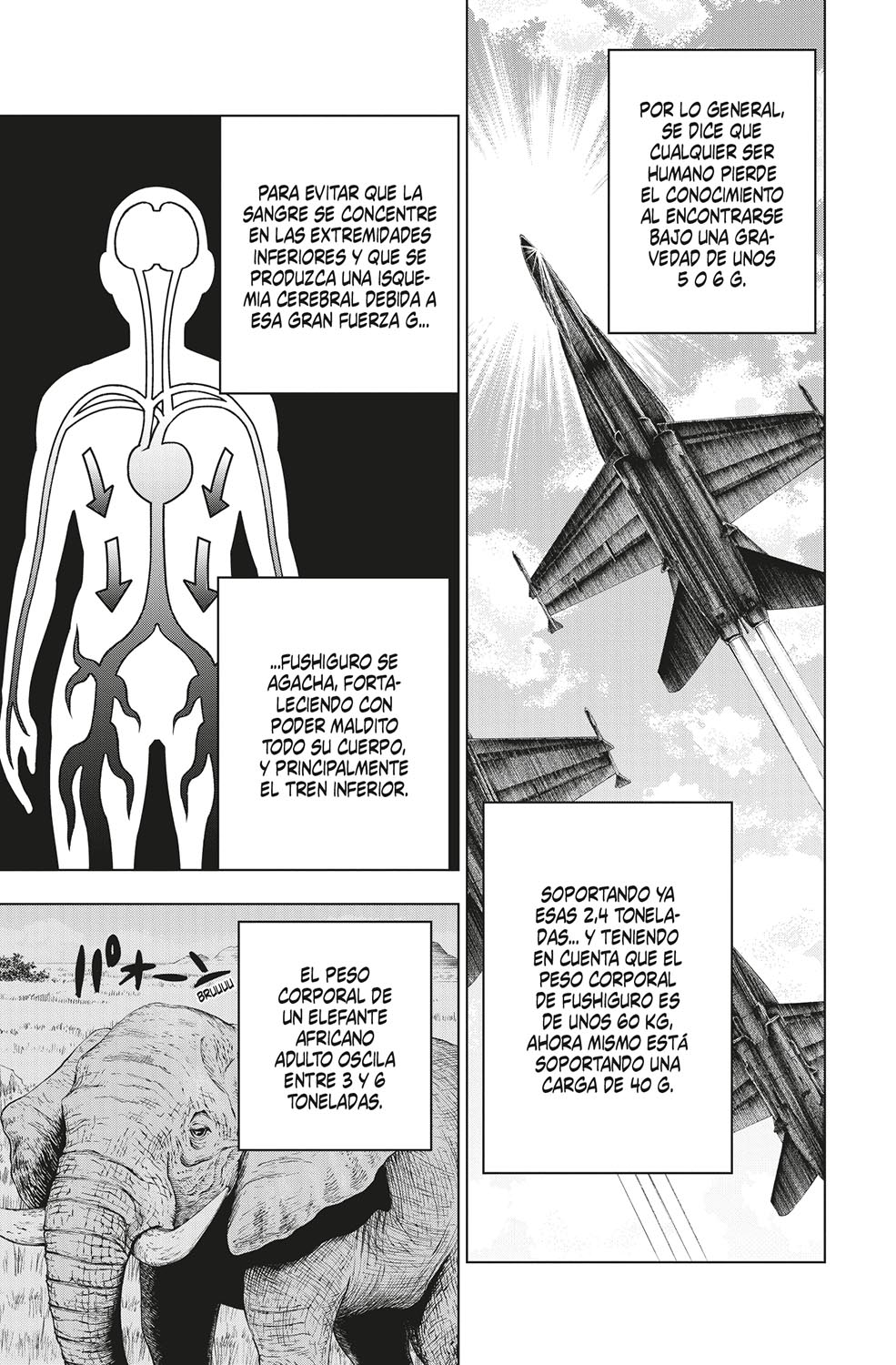 Fushiguro y Reggie están a punto de morir aplastados cada uno por la técnica del otro. Reggie usa su as en la manga para realizar un movimiento que le haga vencedor, ¡¡y el combate a muerte se encamina hacia su recta final!! Por otro lado, en la colonia de Sendai, tras haber destruido Okkotsu el equilibrio existente entre las cuatro fuerzas más poderosas… ¡¿se desata una feroz batalla entre los hechiceros del pasado y un espíritu maldito de categoría especial?!