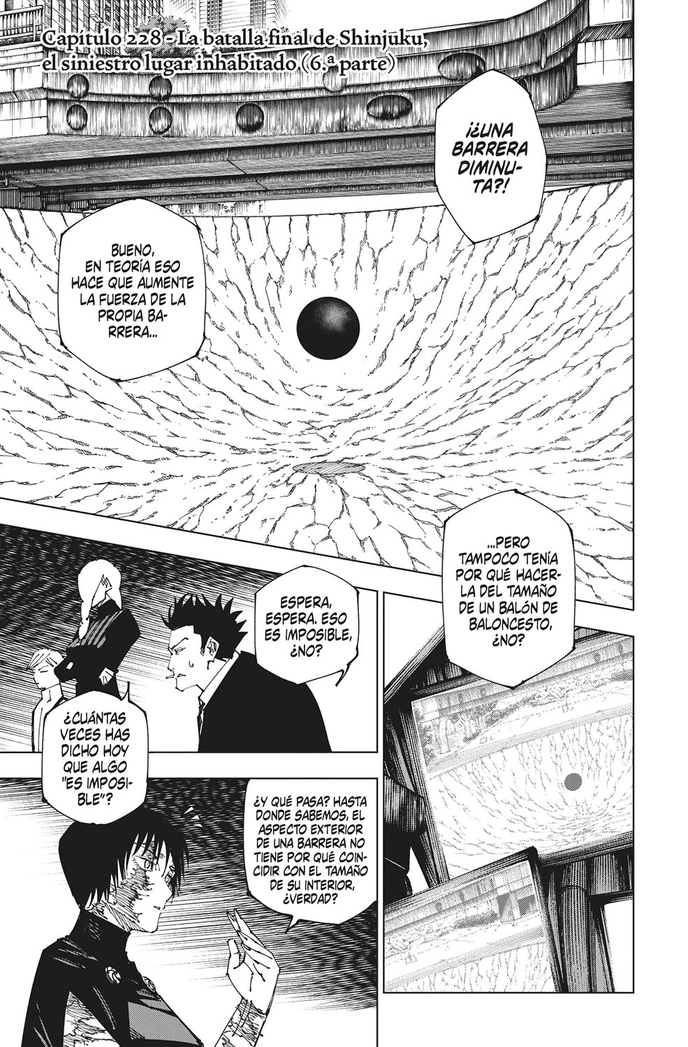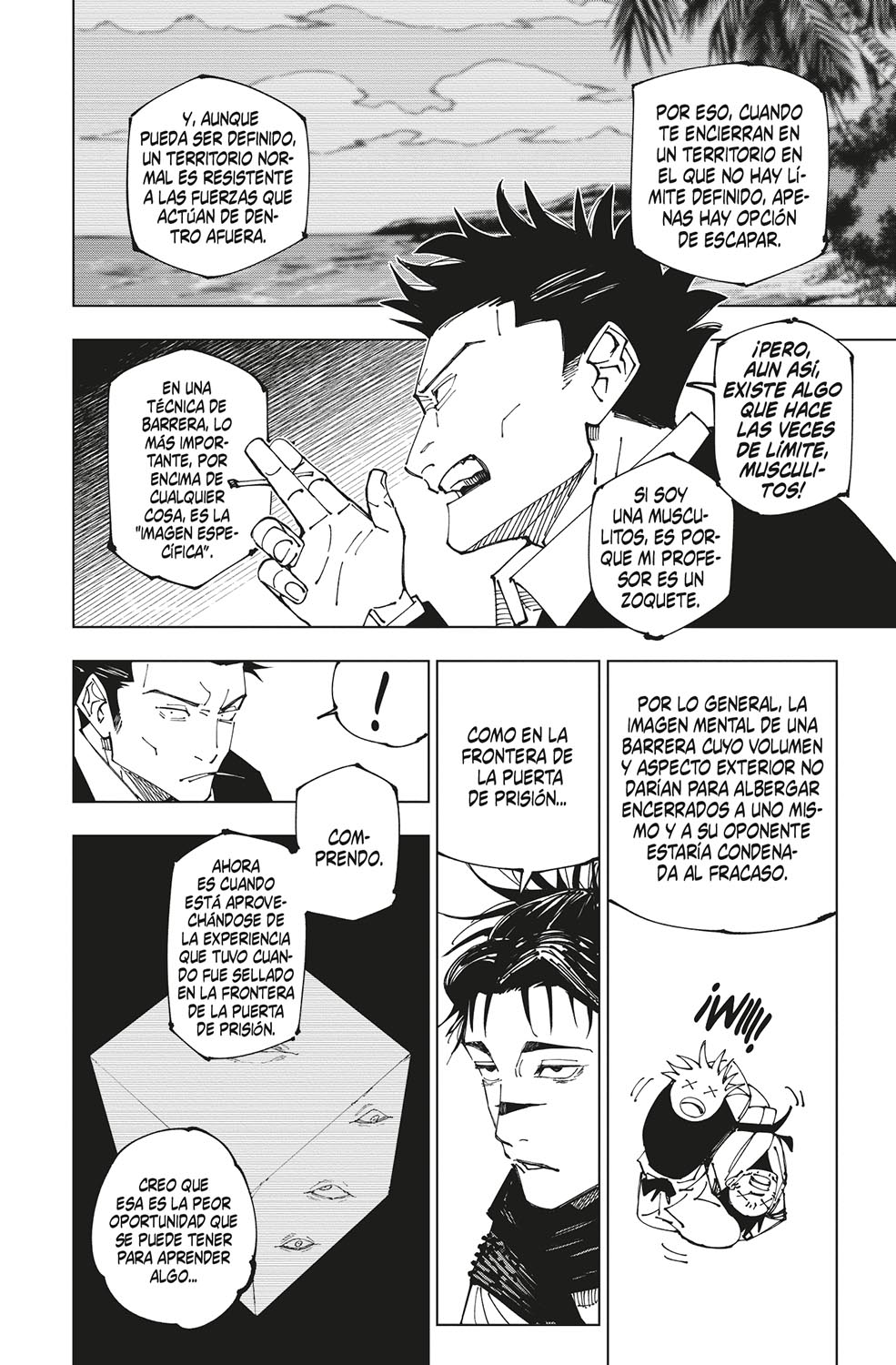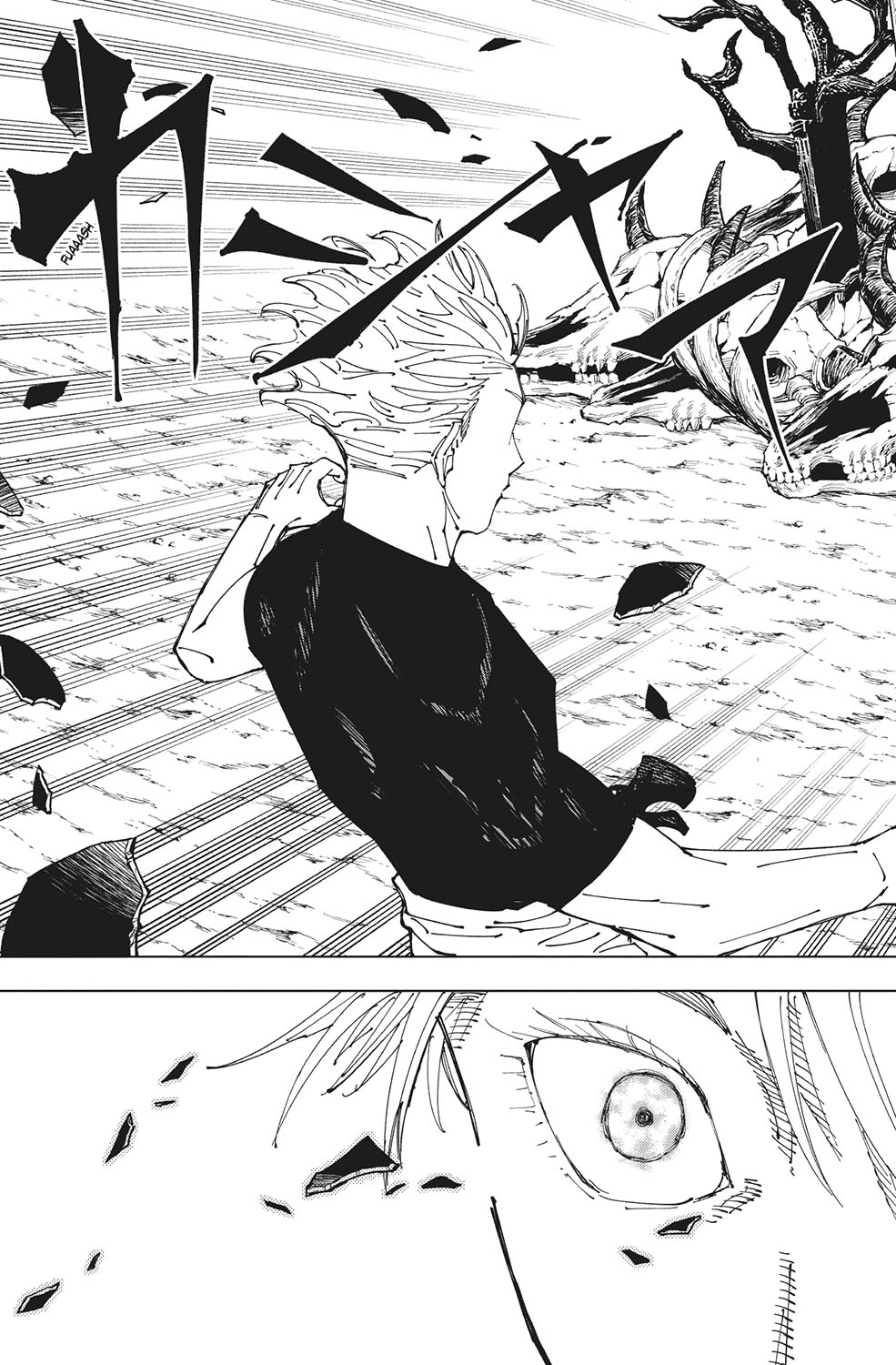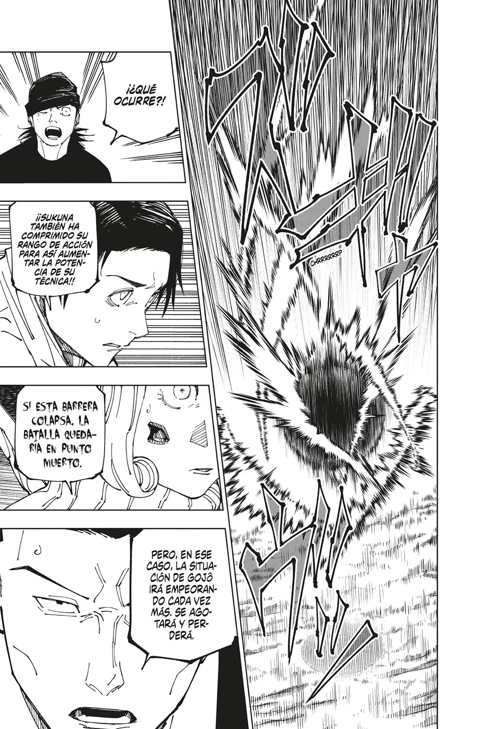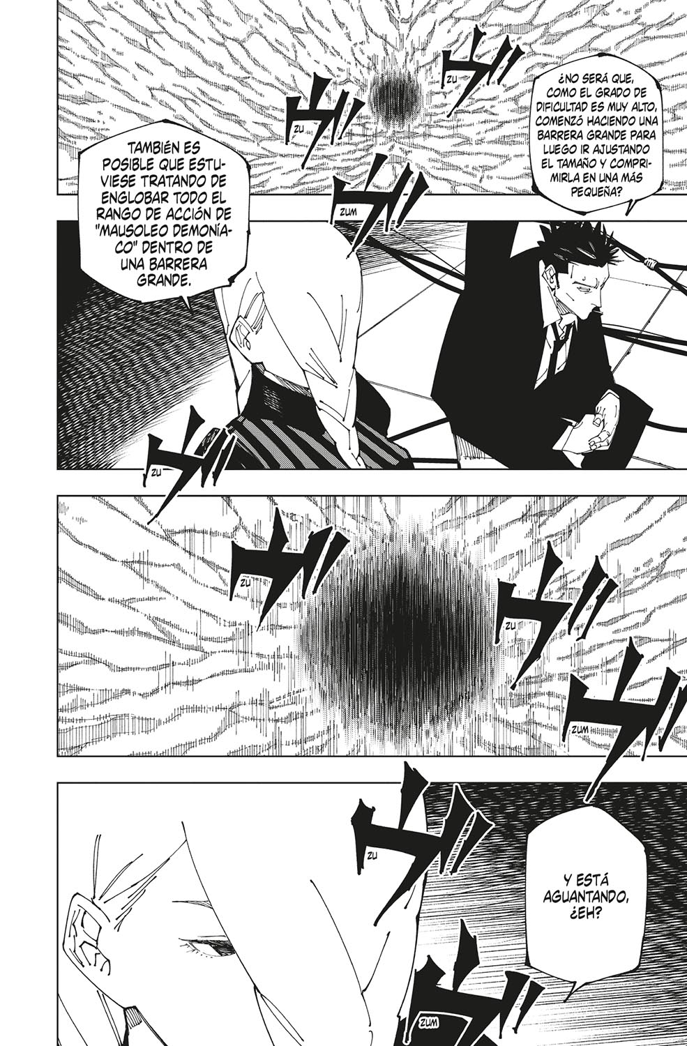 Se trata de un combate repleto de expansiones territoriales sucediéndose de forma simultánea, y con técnicas consumidas restaurándose una y otra vez. Y cuando parecía que el equilibrio de ambas fuerzas se había visto alterado por la invocación de Makora y la imposibilidad de Satoru Gojô de expandir su territorio, de repente…