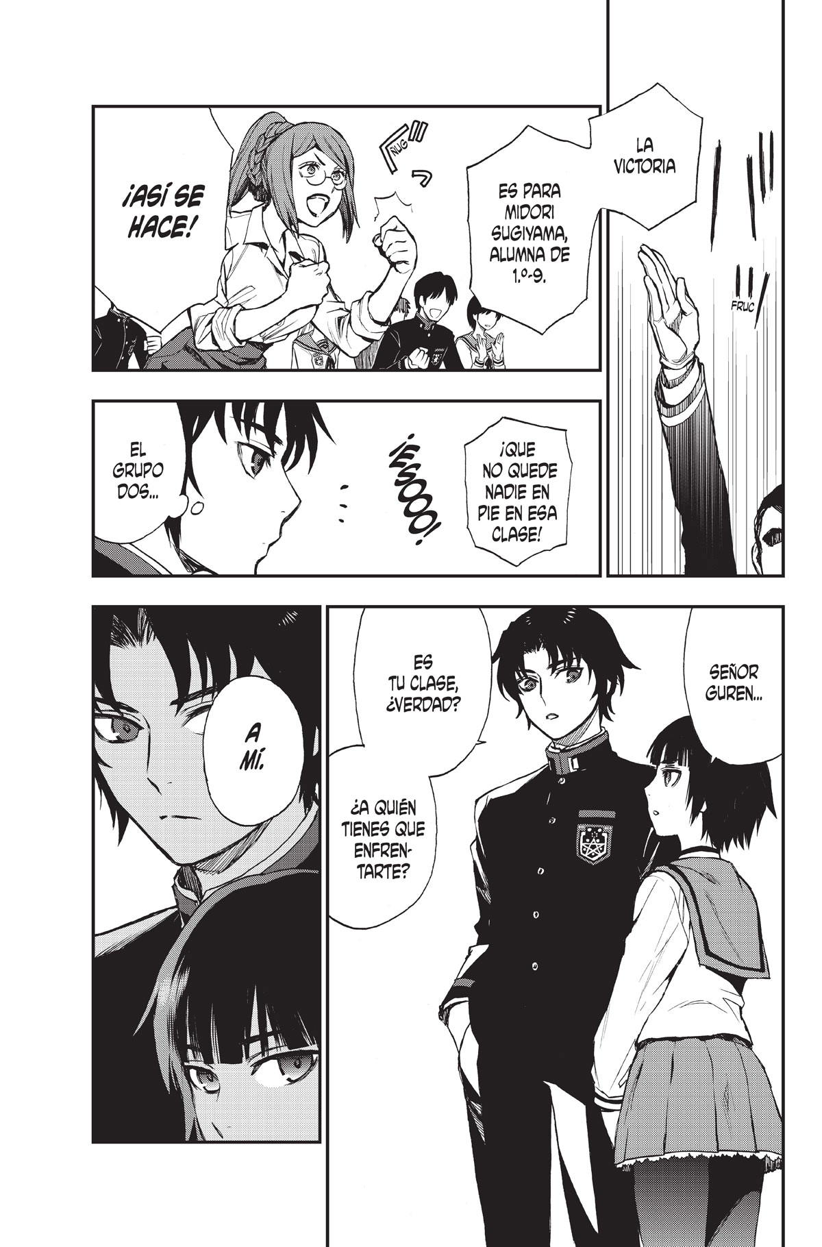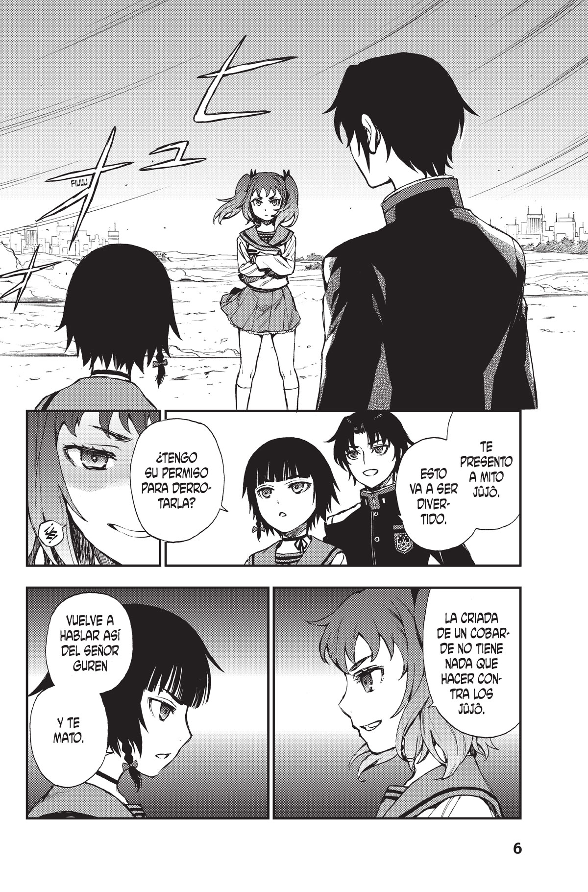 La estancia de Guren Ichinose en el instituto n.º 1 de Shibuya le brinda la oportunidad de conocer a los miembros de la familia Hiiragi, que ejercen su poder sobre este centro, donde se forma a la futura élite de la hechicería nacional. Mientras tanto, la secta Hyakuya se pone en contacto con Guren a través de un misterioso intermediario llamado Saitô. ¡¿Será cierto que el mundo está a punto de ser destruido a causa de un virus de origen desconocido que liberarán los Hiiragi?!