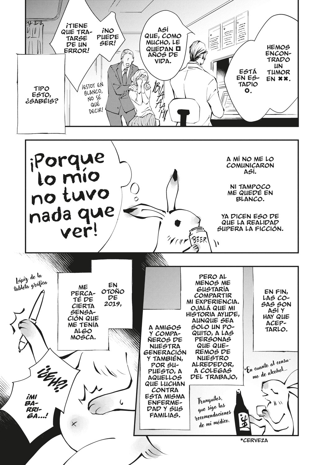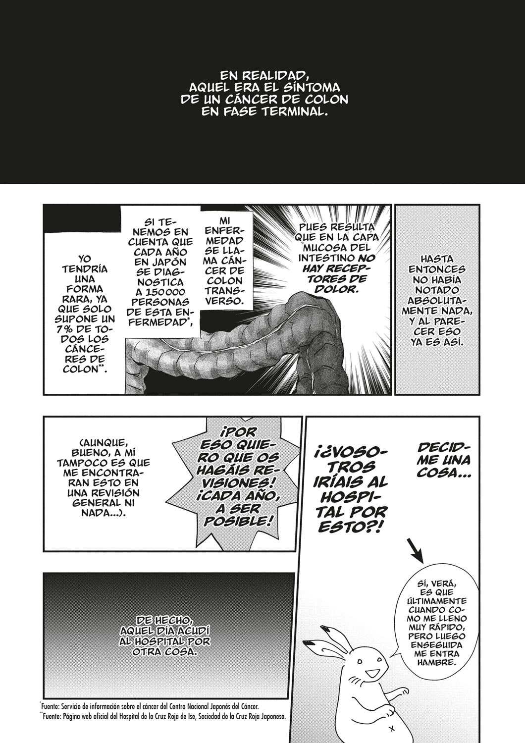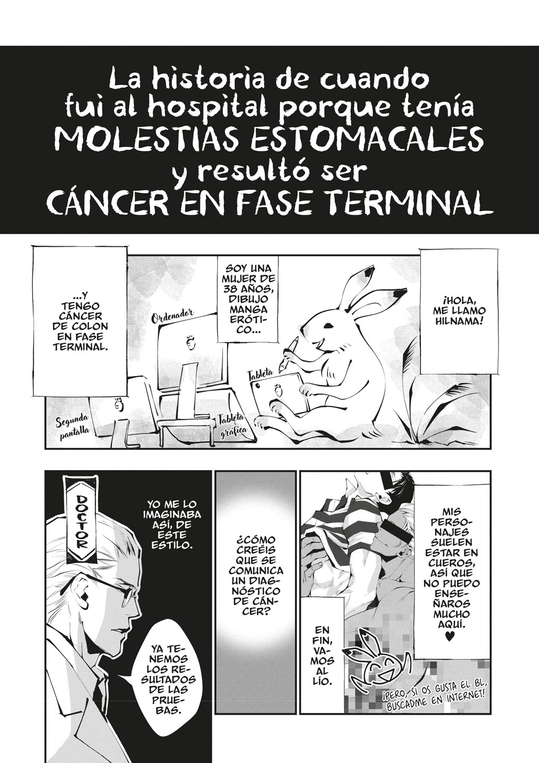 Conmovedor e inspirador relato autobiográfico de una dibujante de manga que recibe, a los 38 años, un demoledor diagnóstico de cáncer de colon en fase terminal. La autora, con una envidiable entereza y buen humor, nos relata cómo asimila el diagnóstico y cómo vive el tratamiento posterior, así como plasma la manera en que su entorno más próximo se adapta a su nueva realidad.