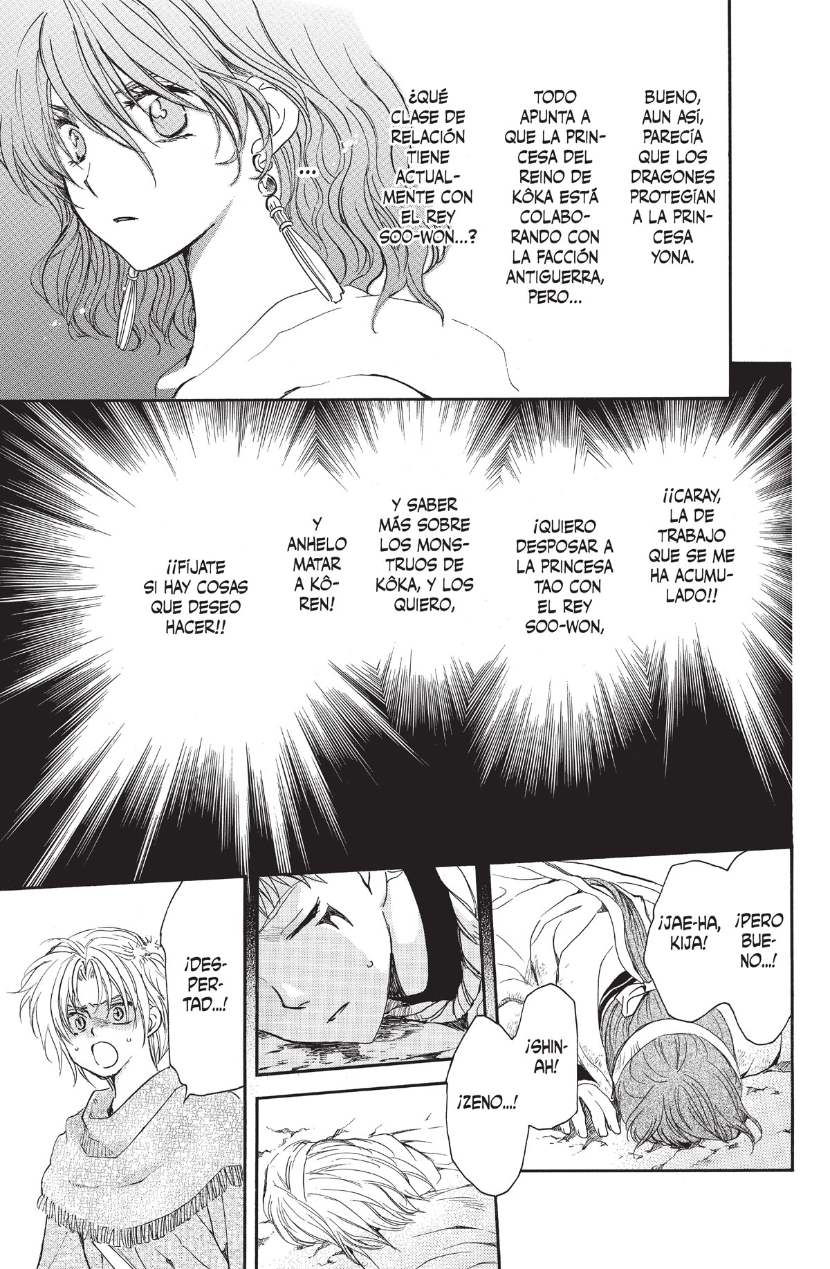 Tras liberar su poder para salvar a Yona, los cuatro dragones quedan inconscientes. En el frente, Yotaka salva la vida gracias al Clan del viento, pero justo entonces llega el ejército del reino de Kôka para celebrar un encuentro entre dirigentes. Yotaka regresa al país de Xin para comunicárselo a la princesa Kôren, pero el sacerdote Gobi tiene otros planes… ¿Cuál será el resultado del encuentro entre el reino de Kôka y el país de Xin...?