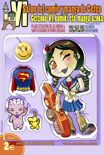 Siguiendo nuestro recorrido por los festivales, jornadas y demás manifestaciones en torno al manga y el cómic que tienen lugar por nuestra piel de toro, ahora nos dirigimos a la localidad vizcaína de Getxo, donde los 23 al 25 próximos tendrá lugar la 6ª edición de su ya veterano Salón del Cómic y Manga de Getxo, con la novedad de que este año habrá, separadamente del espacio cómic, en la Plaza Estación de las Arenas, un espacio totalmente dedicado al manga, en la Plaza Santa Eugenia. Este último ofrecerá concursos (de cosplay, de "karaoke pasiego", de Pump it up...), talleres (de juegos de mesa orientales, de caligrafía japonesa, de cómic...), un friki trivial, una mesa redonda con el tema "global manga" (con la participación de nuestro colaborador J.M. Ken Niimura, quien asimismo dirige el citado taller de cómic), etc., etc. ... El espacio cómic también merece la pena, incluyendo entre otras actividades un homenaje a Francisco Ibáñez con motivo del 50º aniversario de Mortadeloy Filemón. ¡Y todo por 2€ de entrada! ¿Te lo vas a perder? Más información en: www.salondelcomicdegetxo.net