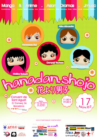 Los y las amantes del shôjomanga tenéis este fin de semana una cita imprescindible en Barcelona: el Hanadan Shôjo. Tendrá lugar el sábado 17 de noviembre, de las 11.00 a las 19.00 en el Centre Cívic Convent de Sant Agustí (C/ Comerç, 36) de la Ciudad Condal, ofreciendo toda clase de actividades en torno a los mangas románticos y/o estudiantiles, repatidas en tres espacios: proyecciones de anime y doramas (incluyendo Fruits Basket), conferencias sobre el shôjo manga y el yaoi, concursos de karaoke, cosplay, fanfics, pullips... en suma, ¡todo lo necesario para pasar un día inolvidable si eres shôjomaníaco/a! El evento es presentado por Imperio Saiyán, Misión Tokyo y Federació Otaku de Catalunya, con la organización de Japan House, Neko Club Otaku y Los Shôjos de Deirdre y el apoyo patrocinador de varias entidades, entre las que se encuentra Norma Editorial.