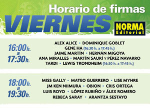 Por último, y después de tanto autor, nos toca a nosotros. Para los que queráis estar informados, os apetezca preguntarnos algo o simplemente, tenéis curiosidad, el sábado 8 de mayo, a las 17h, Óscar Valiente, Anabel Espada y Álex Fernández presentarán las novedades de Norma Editorial para este Saló. Y alguna sorpresilla más seguro que acaba cayendo...