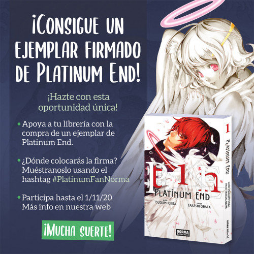 Por la compra de un tomo de Platinum End publicado por Norma Editorial, ofrecemos la oportunidad de conseguir un ejemplar del primer tomo firmado por sus autores, Tsugumi Ohba y Takeshi Obata.