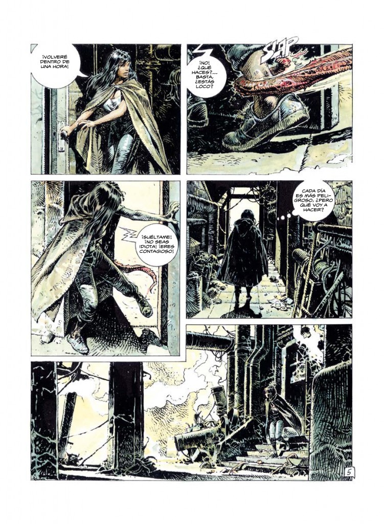 Mientras todo se va desmoronando, la sociedad está pervirtiéndose, cada vez se aleja más de la esencia humana. Lo grotesco y la locura se han apoderado de los ciudadanos que a cada día que pasa se vuelven más mezquinos, egoístas y retorcidos. En una situación así, como os podéis imaginar, la desesperación se apodera de cualquiera que guarde un poco de sano juicio en su interior. Druuna es una de ellas y hace lo que sea con su bello cuerpo para continuar respirando unas horas más.