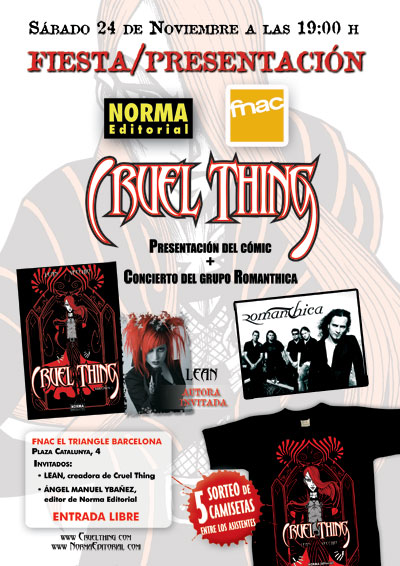 Este sábado 24 de noviembre, en la FNAC El Triangle, en pleno centro de Barcelona, tendrá lugar la fiesta-presentación de Cruel Thing. Además de una presentación del cómic, a cargo de su creadora y guionista, Lean Martínez, y de nuestro editor manga ÁngelManuel Ybáñez, habrá a continuación un concierto del grupo Romanthica. ¡Entre los asistentes sortearemos 5 camisetas de Cruel Thing! Mas información sobre el evento en: http://www.normaeditorial.com/noticias/PresentacionCruelFnac.pdf