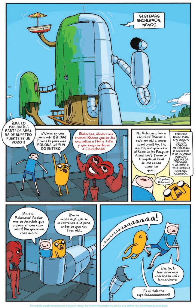 En este nuevo y flipante tomo Finn y Jake descubrirán que su casa en realidad es un superobot que dispara rayos láser a los malos. Una megaconstrucción autómata que creó la Princesa Chicle para su vieja amiga Marceline. Nuestros valientes protagonistas no tendrán suficiente con esto y seguirán buscando emociones fuertes. En una de sus múltiples incursiones en las zonas misteriosas del País de Ooo, Finn y Jake descubrirán una máquina para transformarse en fantasmas. Al principio todo será muy chachi, pero las cosas se van a complicar. ¡¡No siempre mola ser un montruito!!